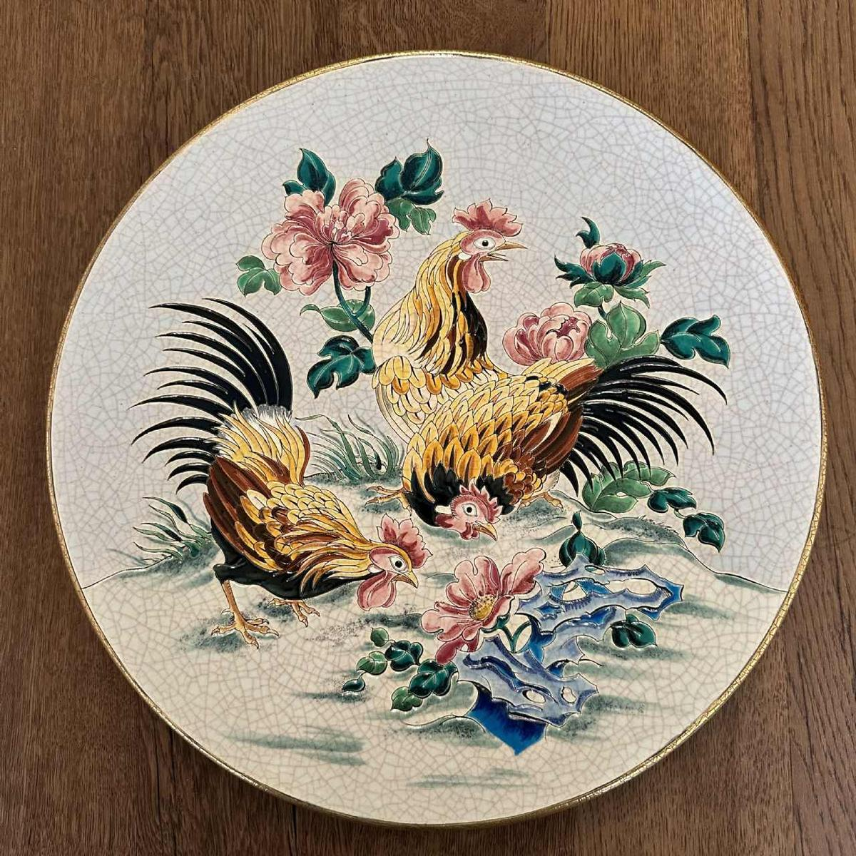 This form is only used to notify us of illegal content on product: Emaux de Longwy, hanen en kippen geglazuurd aardewerk schaal, omringd email, fijne gouden rand.