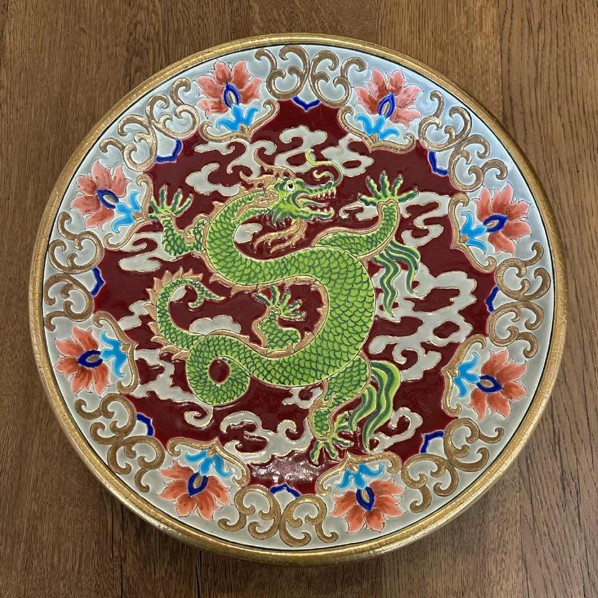 Decor van Rolade Rizzi met een groene draak op een donkerrode achtergrond, exemplaar nr. 39/60, periode 1944/1949