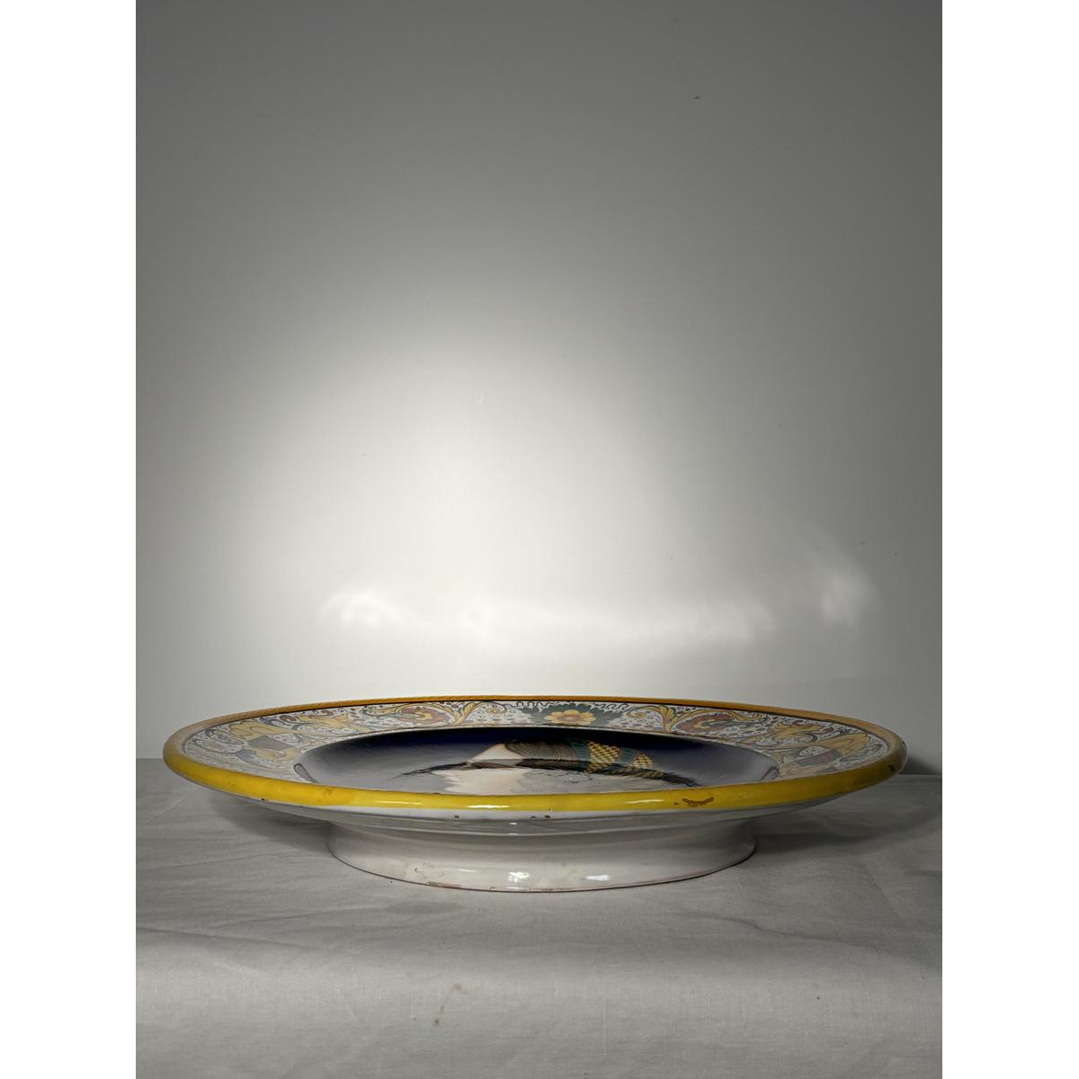 Een elegante en brede majolica schaal uit de werkplaatsen van Deruta, een gerenommeerd Italiaans keramiekcentrum in Umbrië. Gesigneerd "S. Volpi" "In Deruta". Serafino Volpi, een keramist die tussen 1916 en 1918 in Deruta actief was, was directeur van de fabriek "Maiolica Deruta". In 1928 richtte hij, samen met Gino Veschini, de fabriek "Maiolica Derutese Volpi" op. Het jaar daarop werd hij de enige eigenaar. Het bedrijf bleef in bedrijf tot begin jaren 50. Serafino Volpi speelde een cruciale rol in de internationale faam van Deruta in de 20e eeuw en maakte de stad tot een van de belangrijkste Italiaanse keramiekproductiecentra.