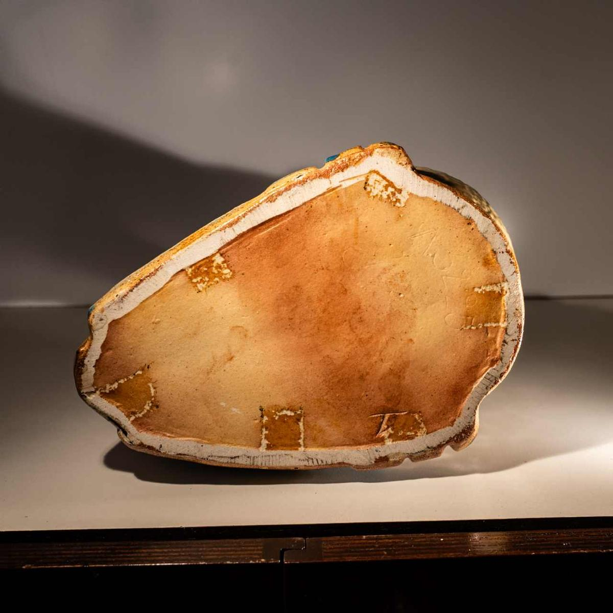 Dit keramische werk, gesigneerd onderaan en genummerd N°3225 voor zijn vorm, maakt deel uit van een bijzonder esthetische reeks met een modernistisch decor geïnspireerd op precolumbiaanse motieven, die doet denken aan Inca- (Nazca) of Azteekse pottenbakkerij.