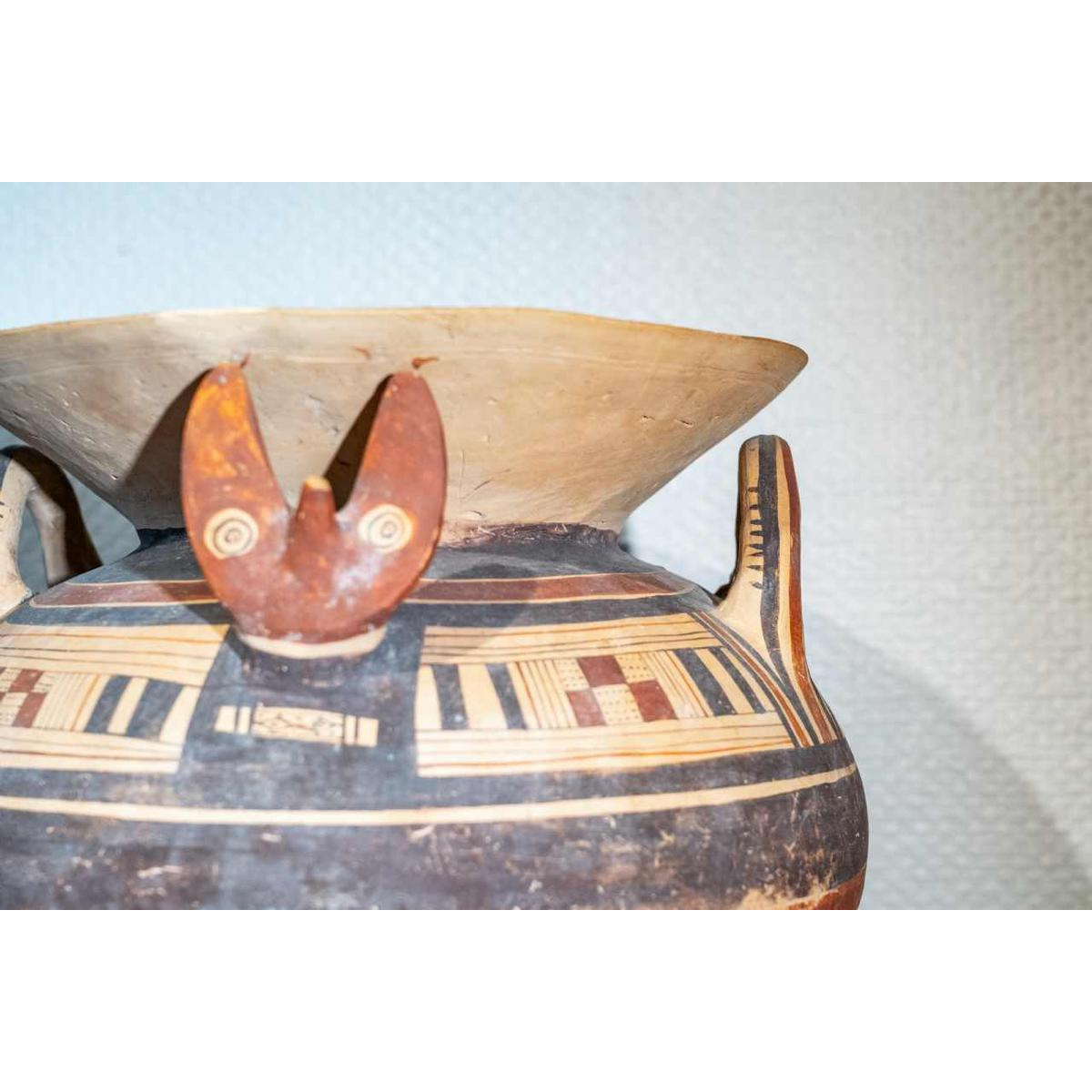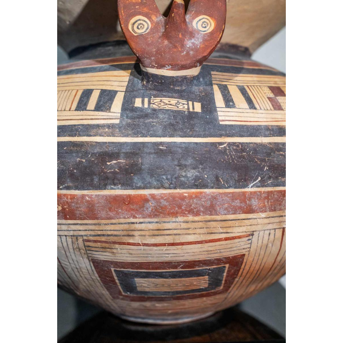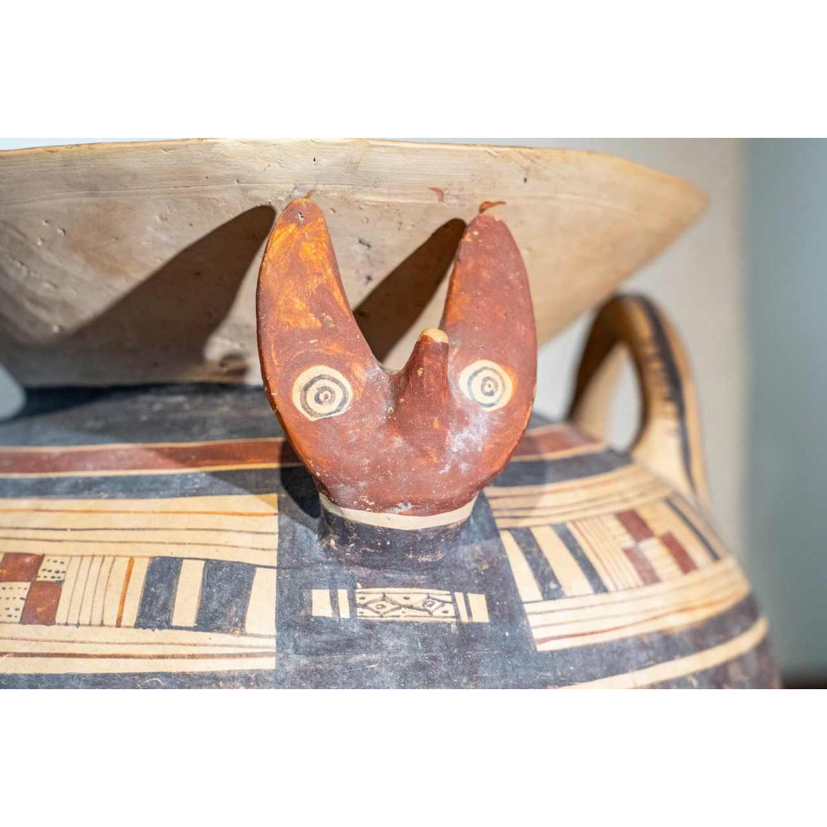 Deze prachtige olla met een bolvormig lichaam. Gemaakt van terracotta is het oppervlak versierd met concentrische banden van bruine en rode pigmenten. De uitlopende lip staat boven een evenwichtig lichaam met twee verticale handvaten. Deze worden afgewisseld met twee zoömorfe uitsteeksels, ook in reliëf: fijn gemodelleerde vossenkoppen met gestileerde maar expressieve gelaatstrekken die uit het lichaam tevoorschijn komen en het object een ritueel of symbolisch karakter geven.