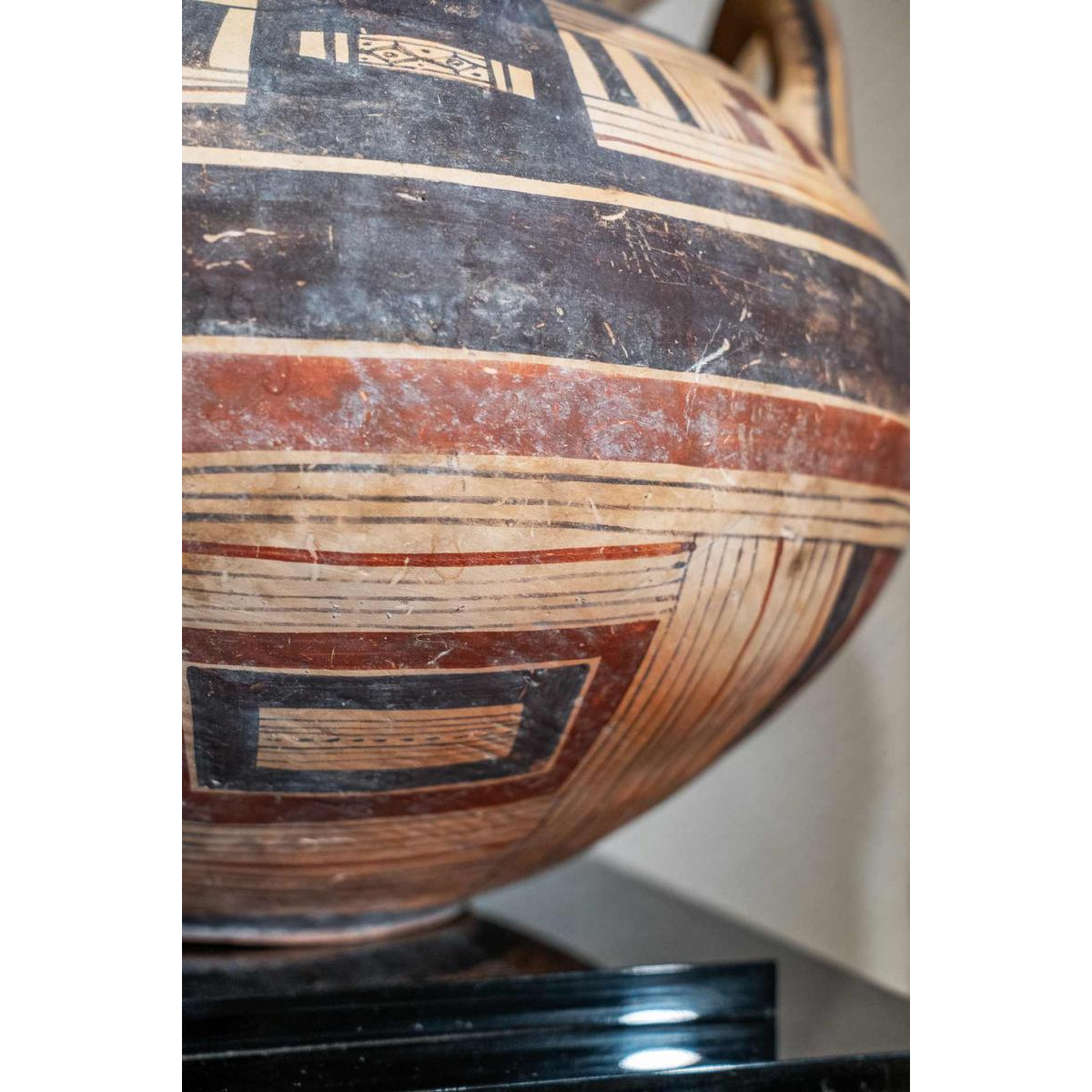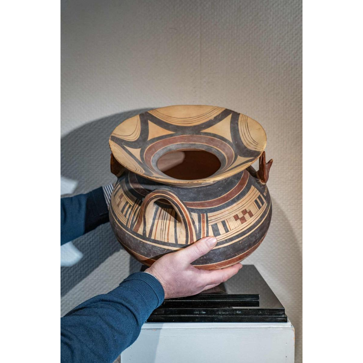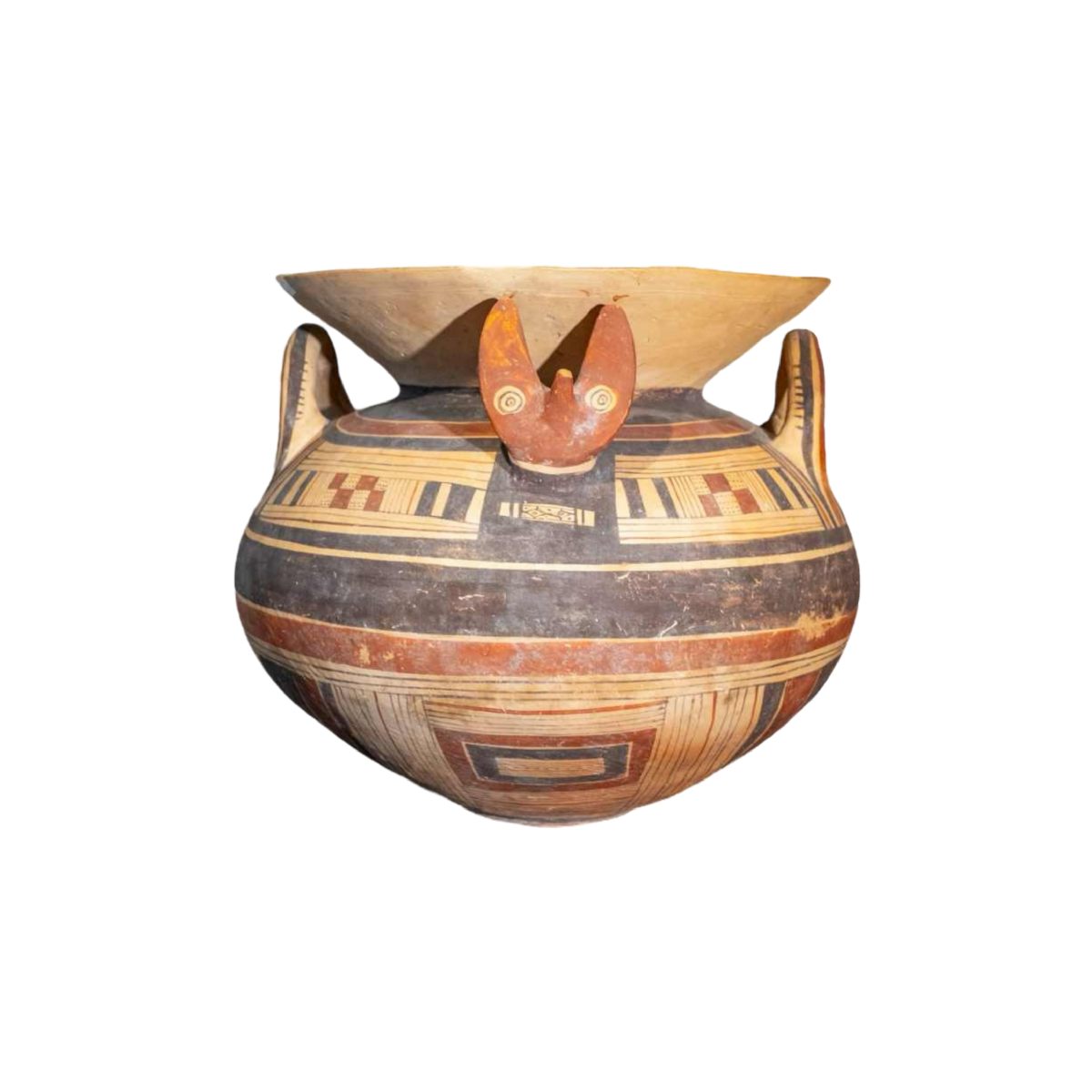 Deze prachtige olla met een bolvormig lichaam. Gemaakt van terracotta is het oppervlak versierd met concentrische banden van bruine en rode pigmenten. De uitlopende lip staat boven een evenwichtig lichaam met twee verticale handvaten. Deze worden afgewisseld met twee zoömorfe uitsteeksels, ook in reliëf: fijn gemodelleerde vossenkoppen met gestileerde maar expressieve gelaatstrekken die uit het lichaam tevoorschijn komen en het object een ritueel of symbolisch karakter geven.