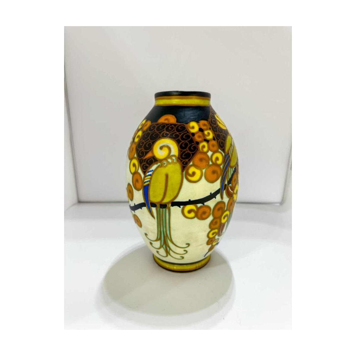 Vaas van keramiek door Charles Catteau voor de Boch-Keramis fabriek in La Louvière, met parkietenmotieven in Art Nouveau-stijl en gele en bruine kleuren.
