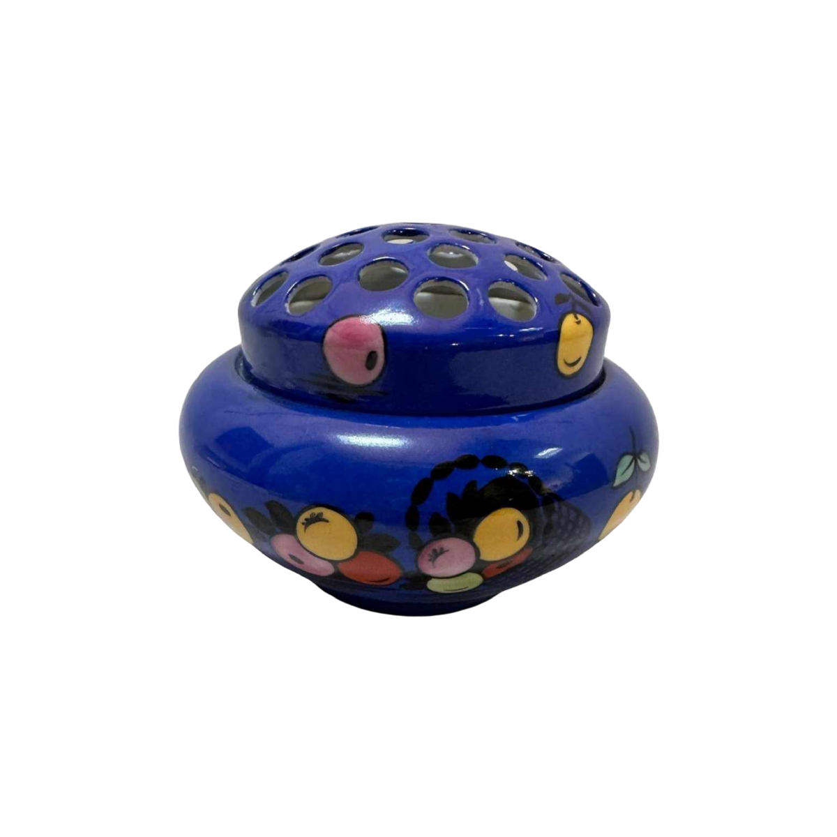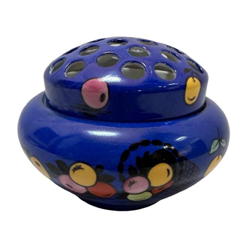 Interessante bloemenhouder met gestileerde fruitmotieven.