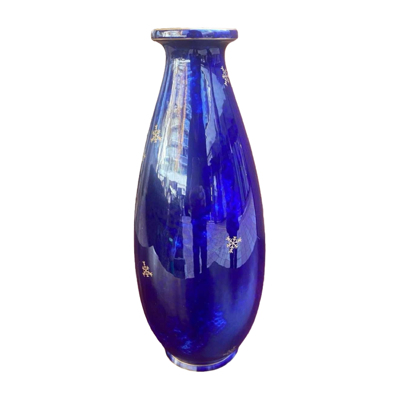 Deze vaas van de Manufacture nationale de Sèvres blijkt een uitzonderlijk stuk te zijn. Het harde porselein staat bekend om zijn kwaliteit en finesse en de decoratie van gouden sneeuwvlokken op een middernachtblauwe achtergrond roept een elegant en verfijnd beeld op. De hals en hiel, geaccentueerd met een vergulde lijstrand, voegen waarschijnlijk nog een extra vleugje verfijning toe aan dit toch al opmerkelijke stuk.