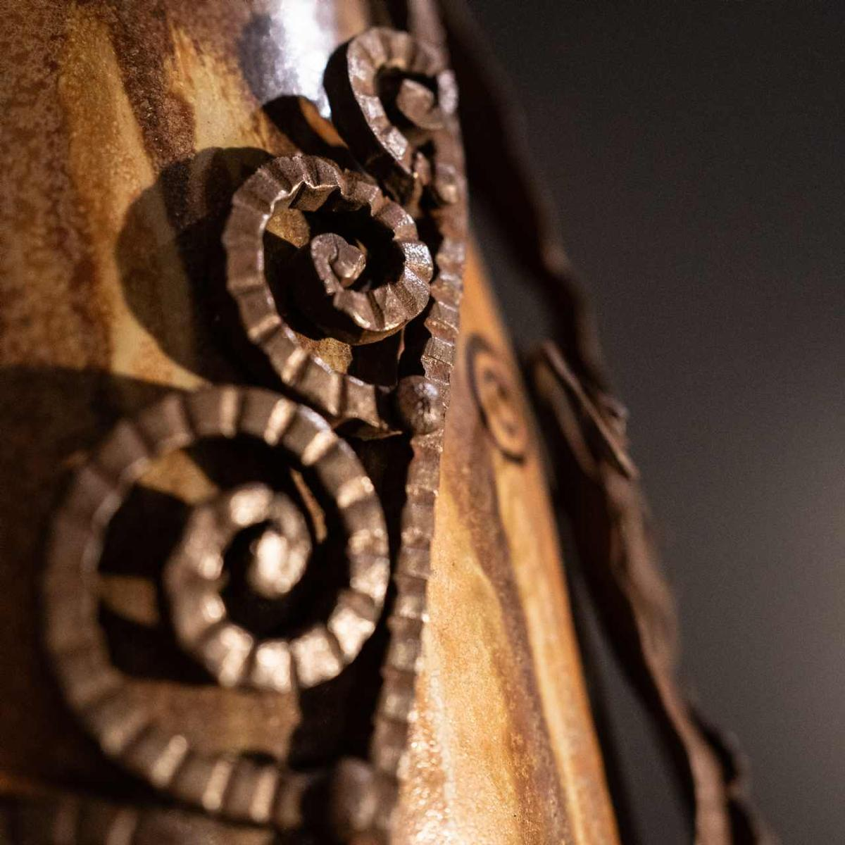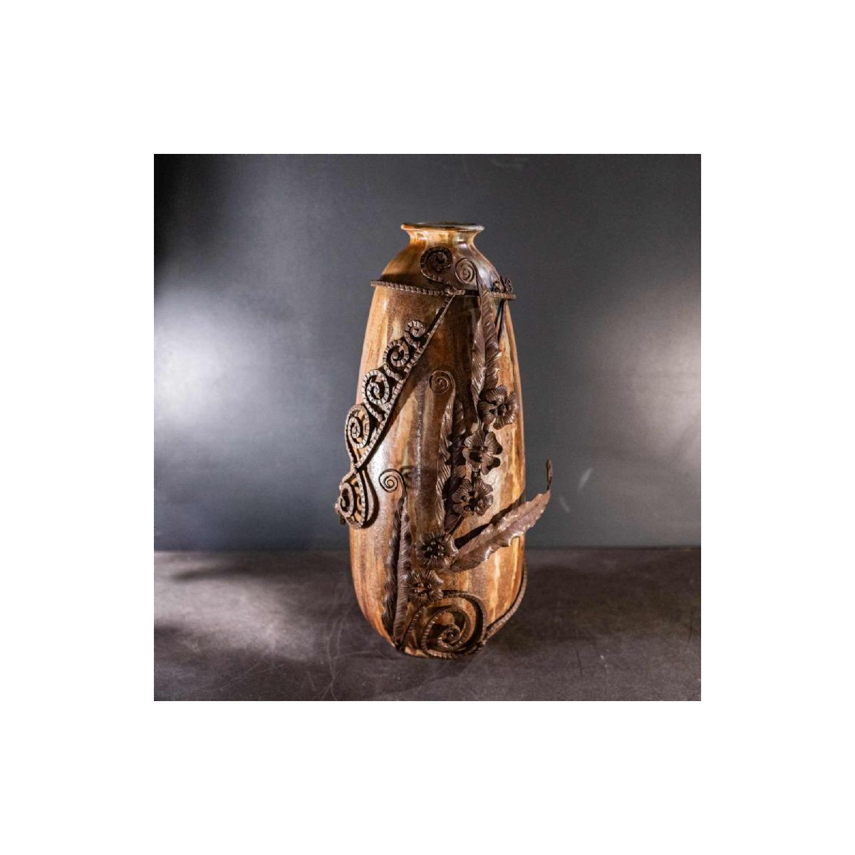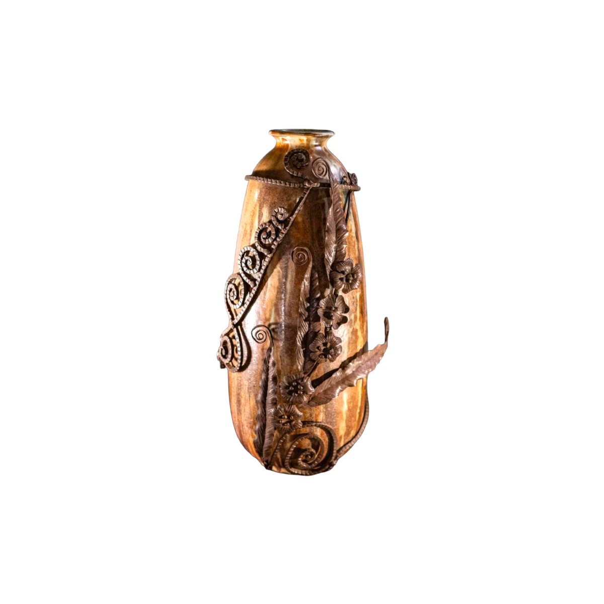 De vaas is versierd met een smeedijzeren frame van François Carion, een Belgische ijzerbewerker die ook frames maakte voor Schneider glazen vazen in Frankrijk.