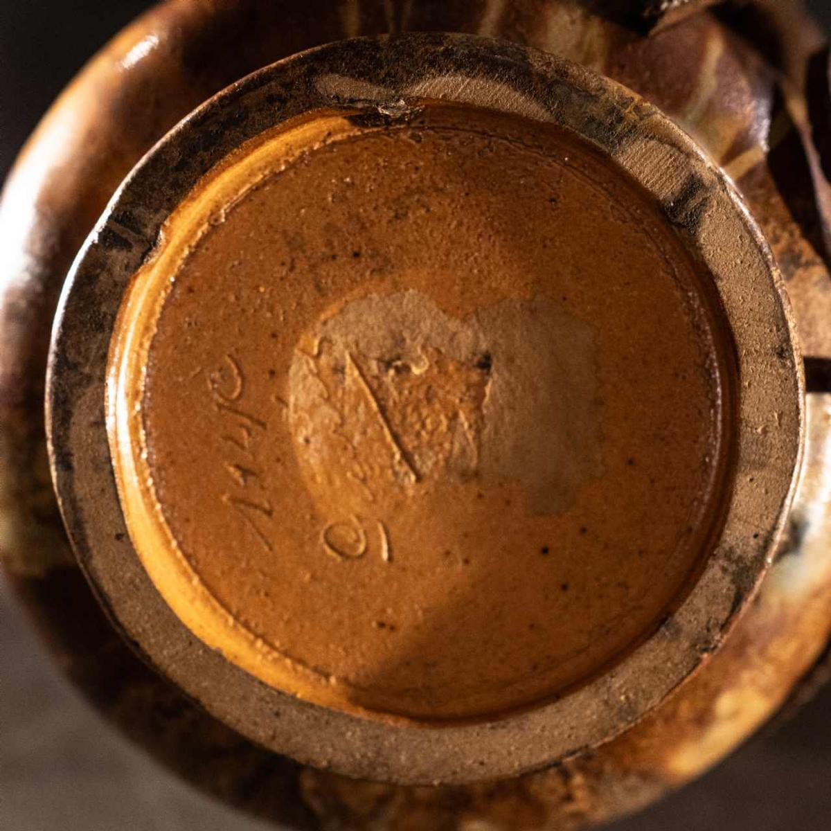 Roger Guérin (1896-1954) was een Belgische keramist ( Bouffioulx ) van grote bekendheid in de 20e eeuw, met name in de Art Deco periode. en een vriend van Edgard Aubry. Hij werd in 1896 in België geboren en toonde een grote belangstelling voor keramiek. Hij schreef zich in aan de Université du Travail in Charleroi, waar hij aardewerk studeerde bij Willem DELSAUX. Hij evolueerde van Art Nouveau naar Art Deco (tussen 1915 en 1945) en creëerde vazen en sculpturen in “GRES SALE GRAND FEU” in één enkele stook (1300°). Hij ontwikkelde zijn talent in de 2 artistieke stijlen van zijn tijd. In 1934 werd hij benoemd tot PROFESSOR aan de Université Supérieure des Arts Décoratifs de la CAMBRE in BRUSSEL. Perfect in zijn creaties, werd hij gecontacteerd voor talrijke artistieke samenwerkingen en produceerde stukken voor gerenommeerde kunstenaars (Belgische en buitenlandse) zoals Marcel Wolfers, Cris Agterberg (Amsterdamse School in Nederland), Thierry Van Rijswijck, Domien Ingels, Cris Lebeau (Amsterdamse School in Nederland), Angelo Hecq... De vazen met smeedijzeren frame zijn het resultaat van een samenwerking met François Carion (verlichting en lampenvoeten voor de kristalfabriek Muller Frères Lunéville).