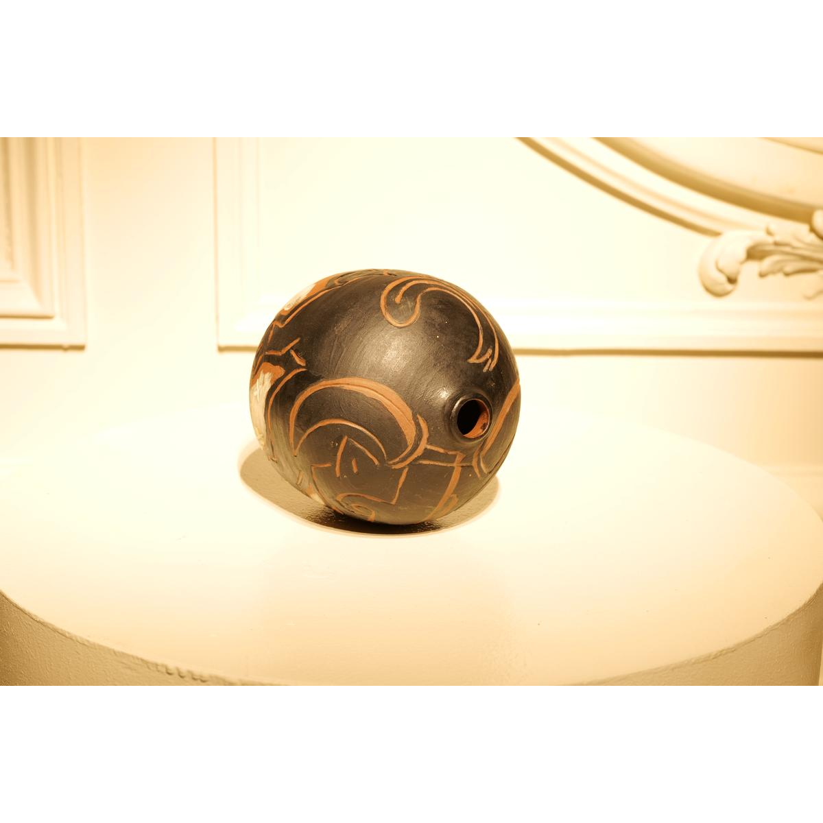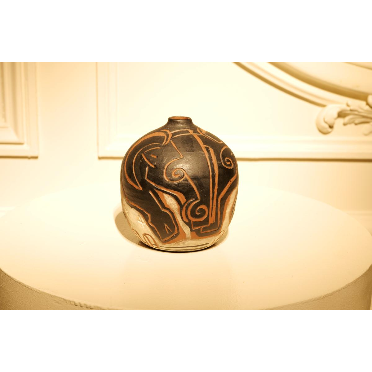 Deze keramische vaas, een uniek werk van Kelli Bedrossian, illustreert de mythische en symbolische dimensie die het werk van de kunstenares kenmerkt. Op het ronde oppervlak van de vaas beeldt de kunstenares een gestileerde stier af, getekend met brede inkepingen en kleuraccenten die zich verstrengelen in een netwerk van dynamische lijnen. De oker- en sienna-kleurige contouren steken krachtig af tegen een diepzwarte achtergrond, waardoor het werk zowel een sculpturale als een picturale uitstraling krijgt.
