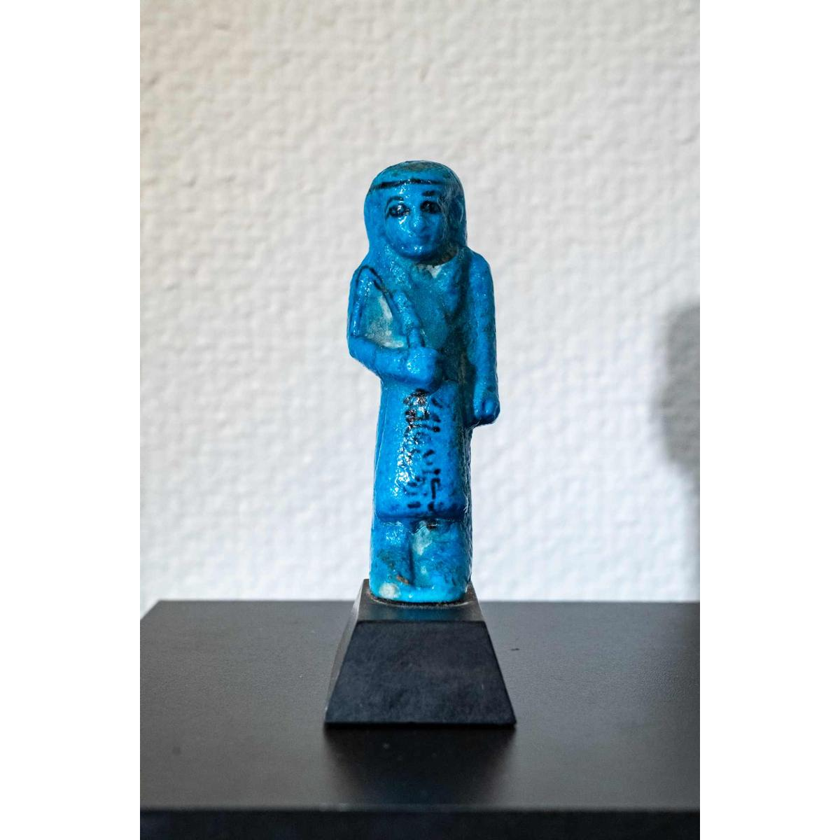 This form is only used to notify us of illegal content on product: Ouchebti-voorman in kobaltblauw aardewerk op naam van Djed-Khonsou-iouf-Ânkh, ca 1080 - 945 voor Christus.