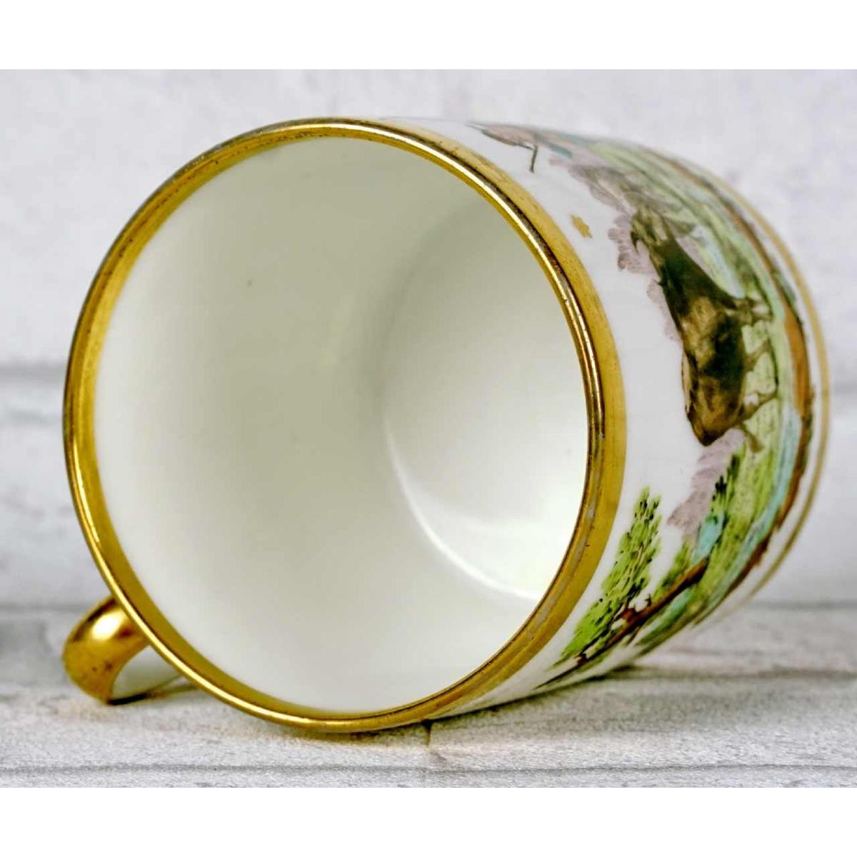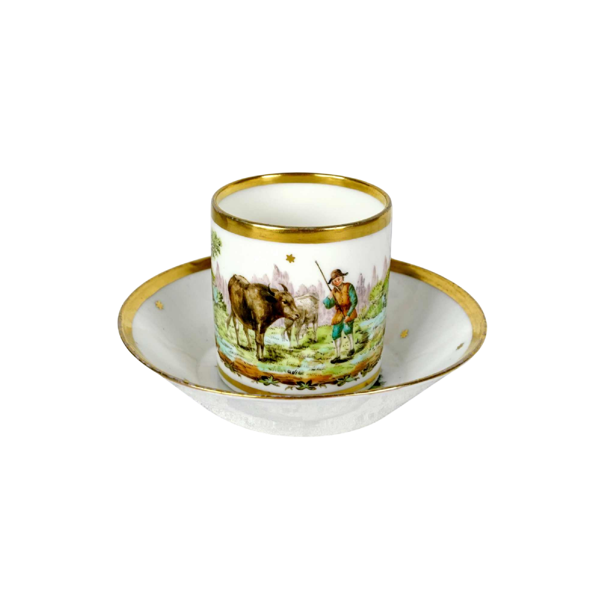 Individuele beker voor het drinken van vloeistoffen, meestal warm. De beker heeft een verticaal handvat met een afgeronde "komma"-vorm. Hij is cilindervormig met een platte basis die op een lichte hak rust. De bijpassende schotel heeft ook een platte basis die op een lichte hiel rust en een aflopende rand. De naam "litron" kopje werd gegeven door de Manufacture de Vincennes rond 1752. Dit model was geïnspireerd op de choppe. Kopjes en schotels verschenen in series vanaf het begin van de 18e eeuw. HARD porselein. Witte achtergrond met polychrome decoratie van boerderijdieren op een landschappelijke achtergrond - Gouden filets rond de randen.