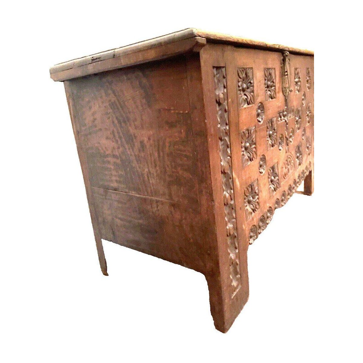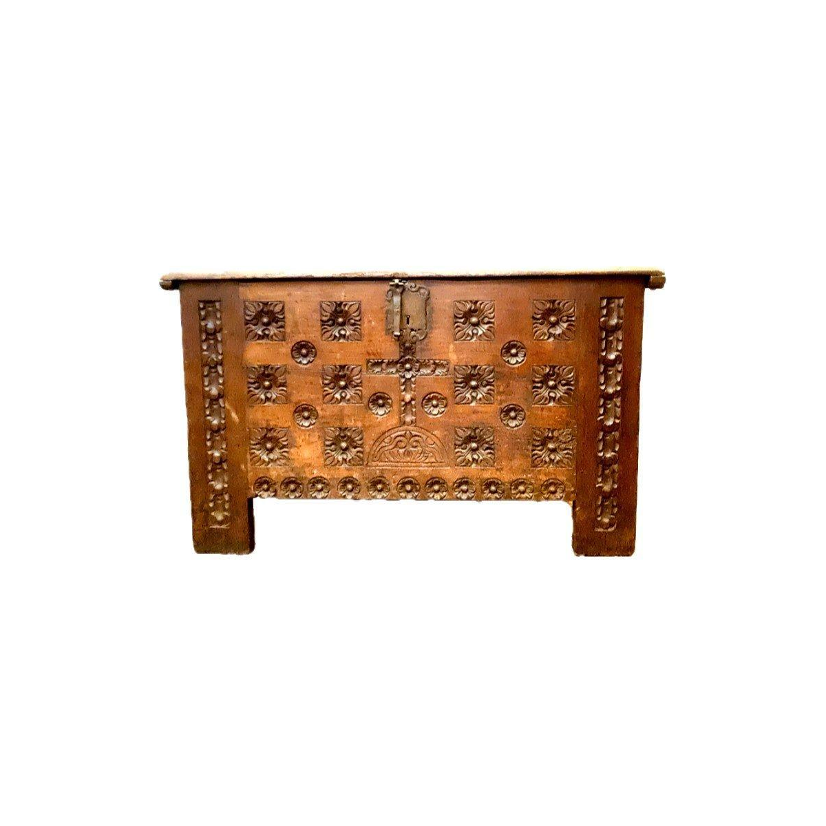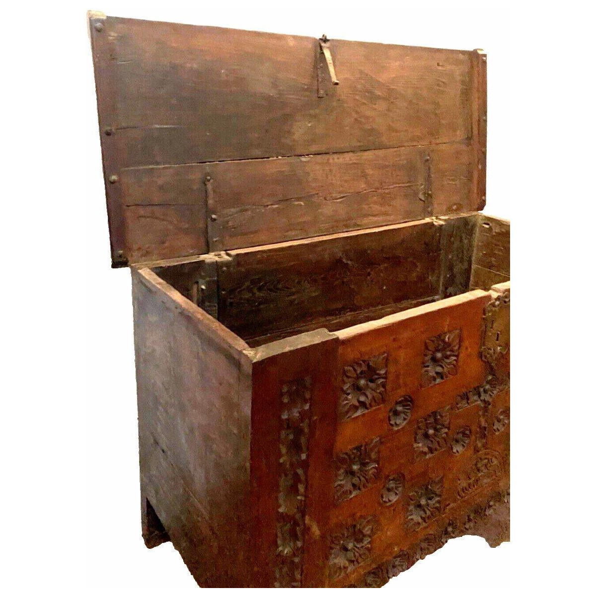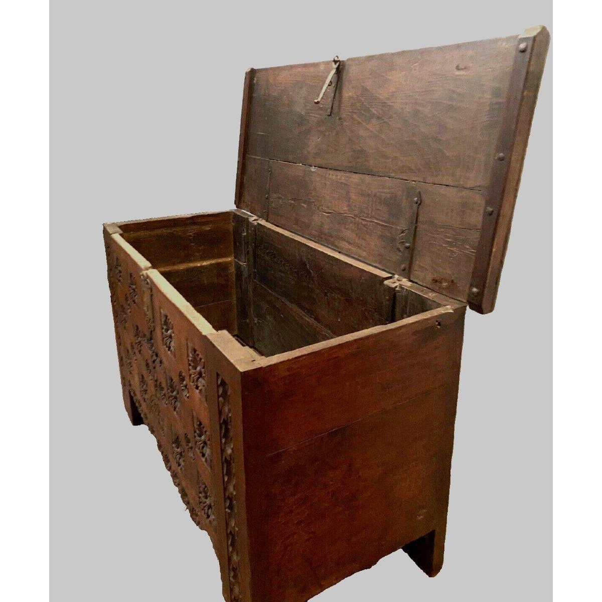 Antieke eikenhouten kist in renaissancestijl, gesneden uit de 18e eeuw.