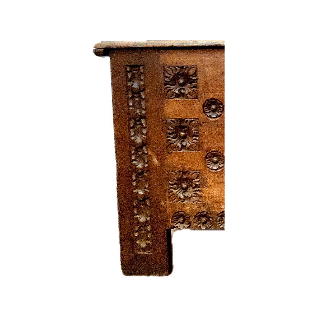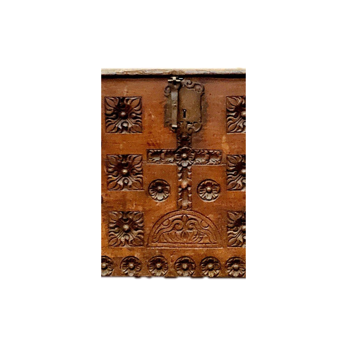 Antieke eikenhouten kist in renaissancestijl, 18e eeuw. Antieke kist in renaissancestijl, gemaakt van massief eikenhout. De voorkant is rijkelijk versierd met rozetten en een centraal kruis. In goede staat. Afmetingen: H 86 x B 144 x D 62 cm. 18e eeuw. Meer foto's beschikbaar op aanvraag. Voor internationale verzending kunt u contact met mij opnemen. Dank u wel.