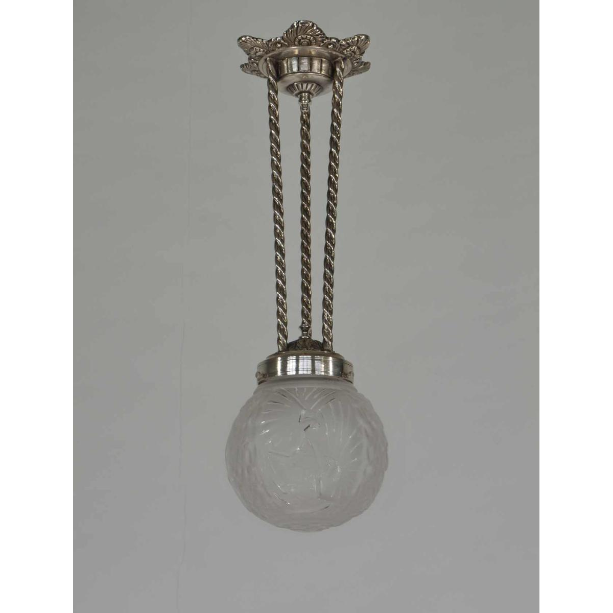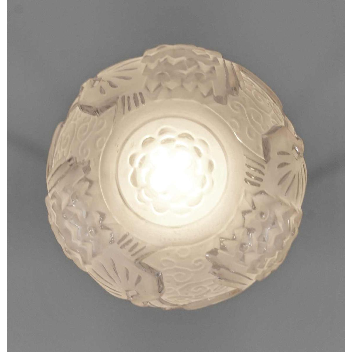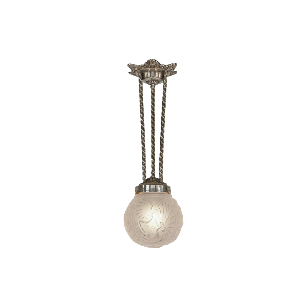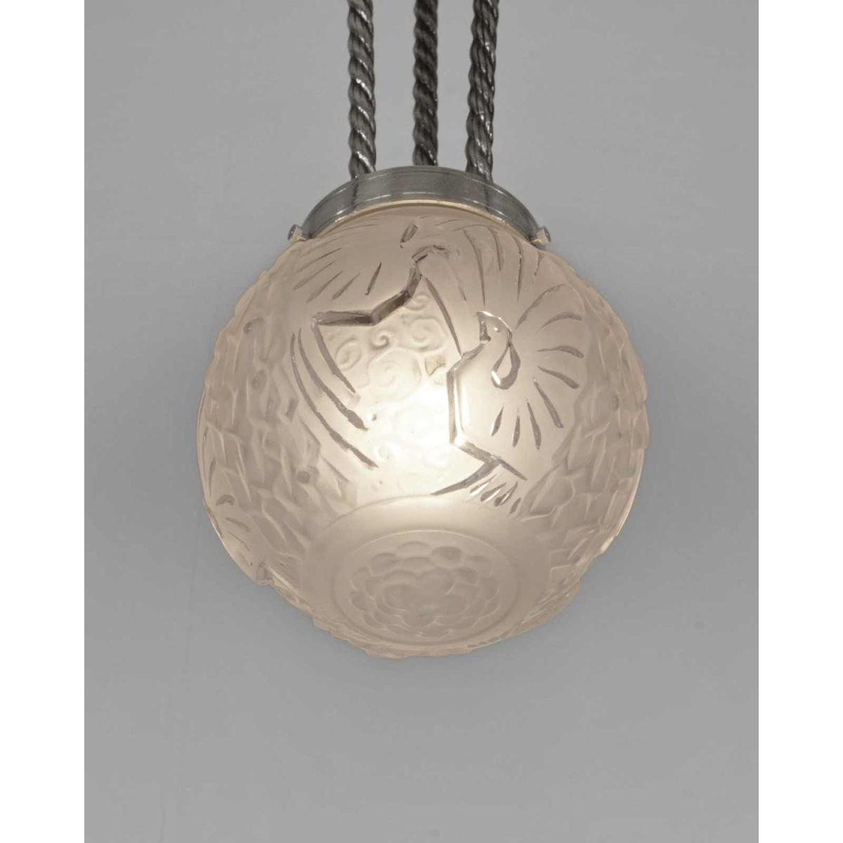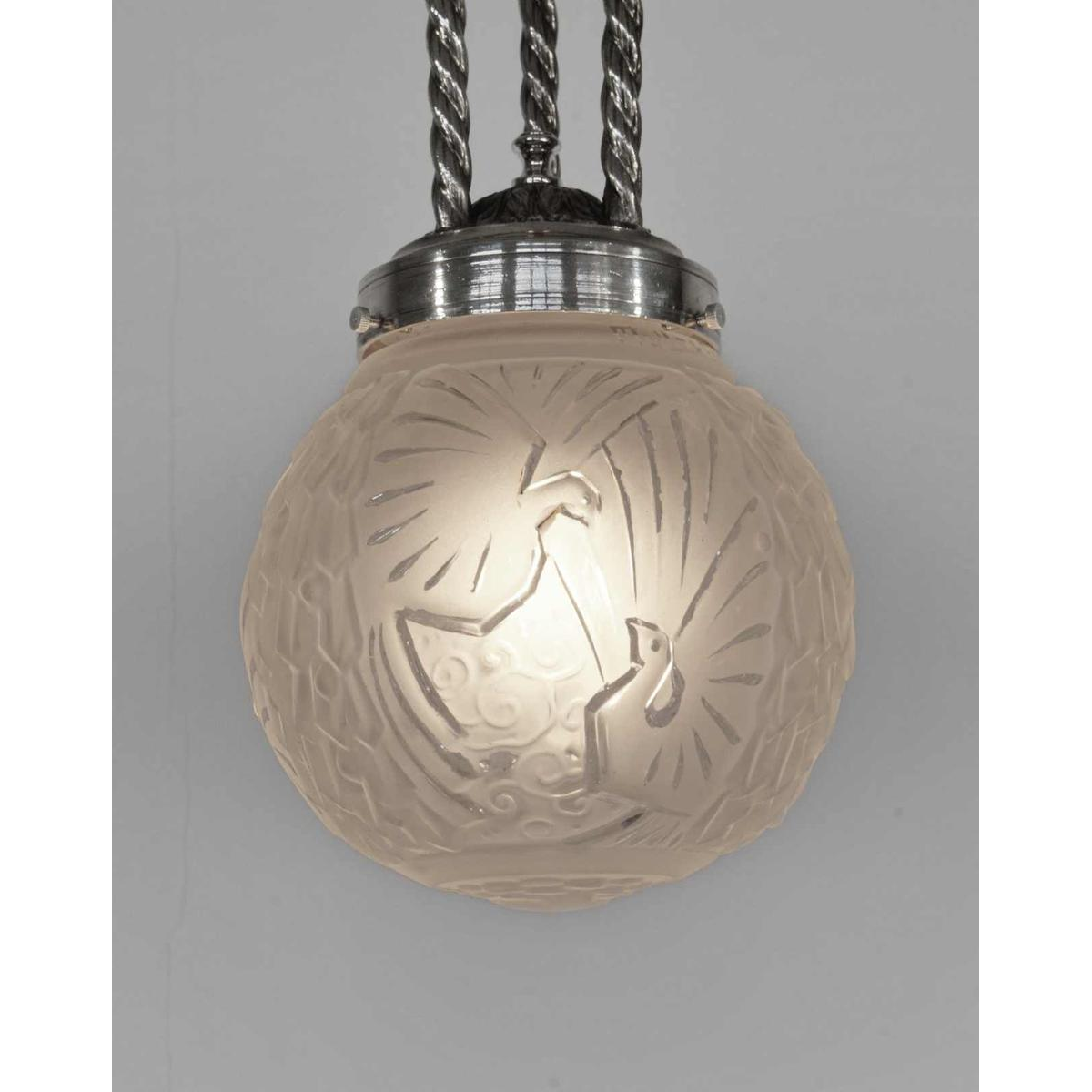 Een prachtige Franse art deco hanglamp. Gemaakt rond 1930 in vernikkeld brons of massief messing. De hanglamp werd gemaakt door Henri Petitot. Met glazen bol in geperst glas van Muller frères met een decoratie van gestileerde pauwen.
