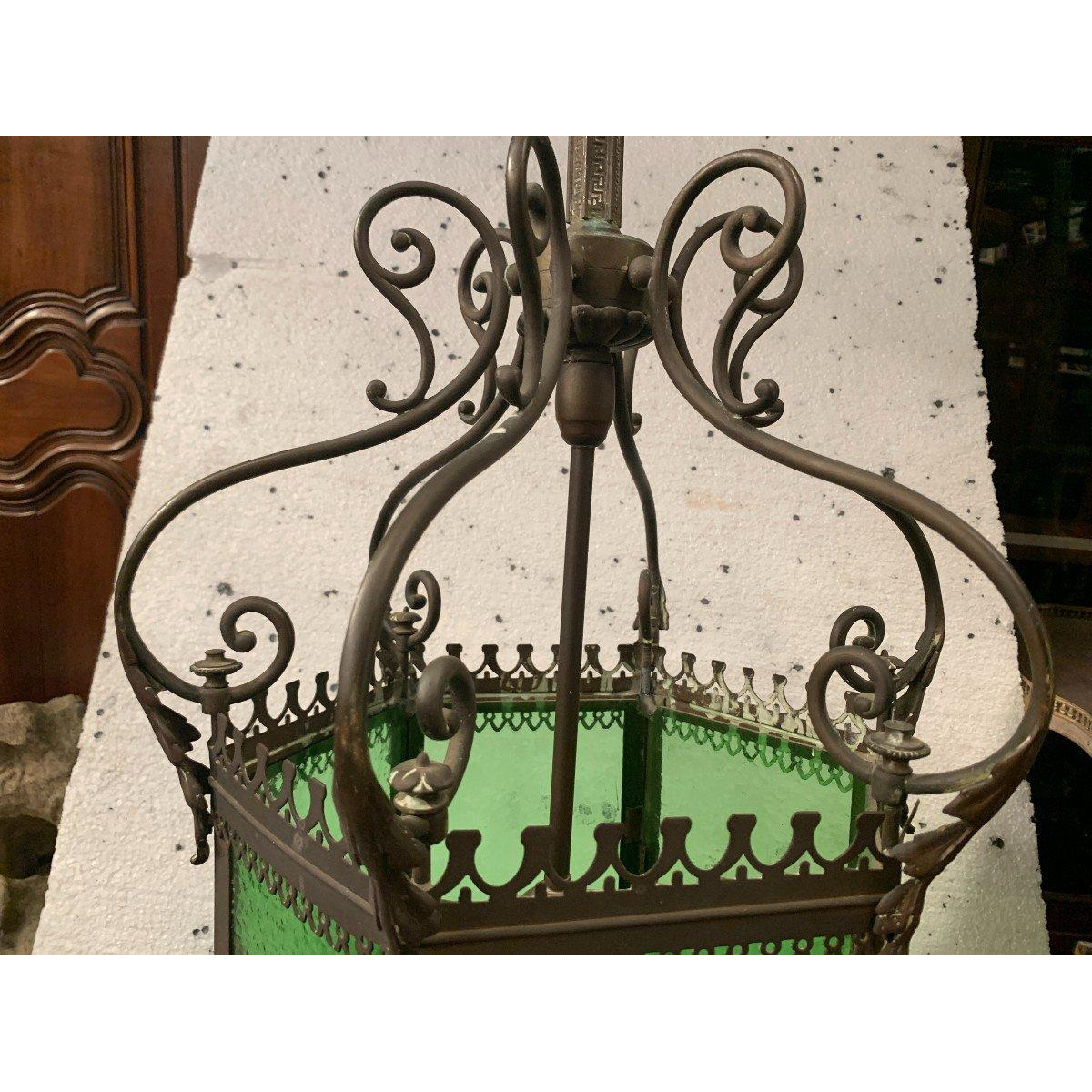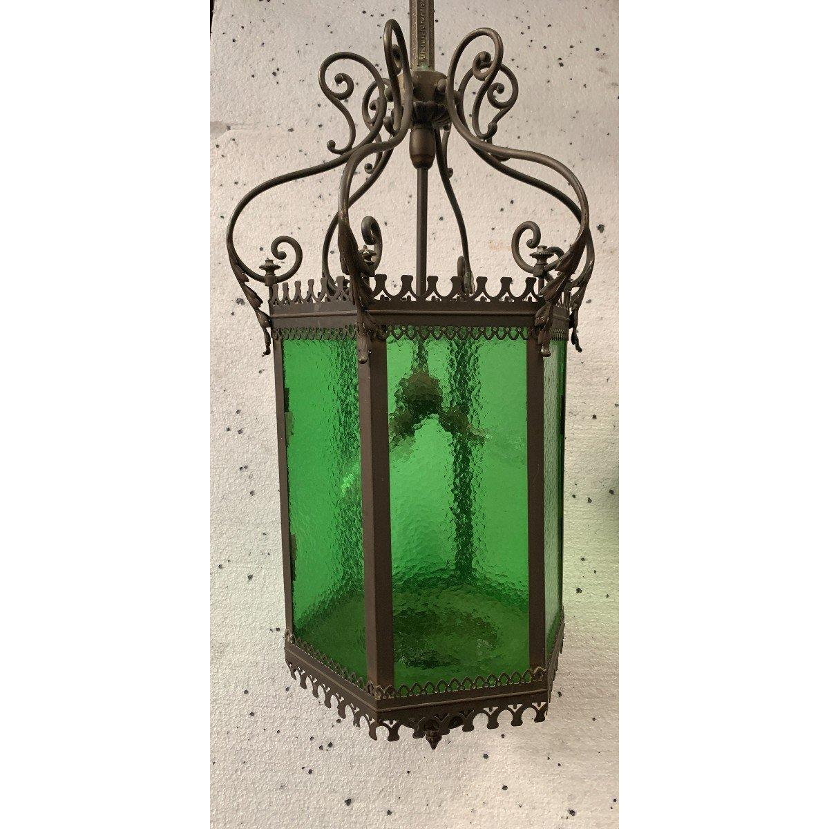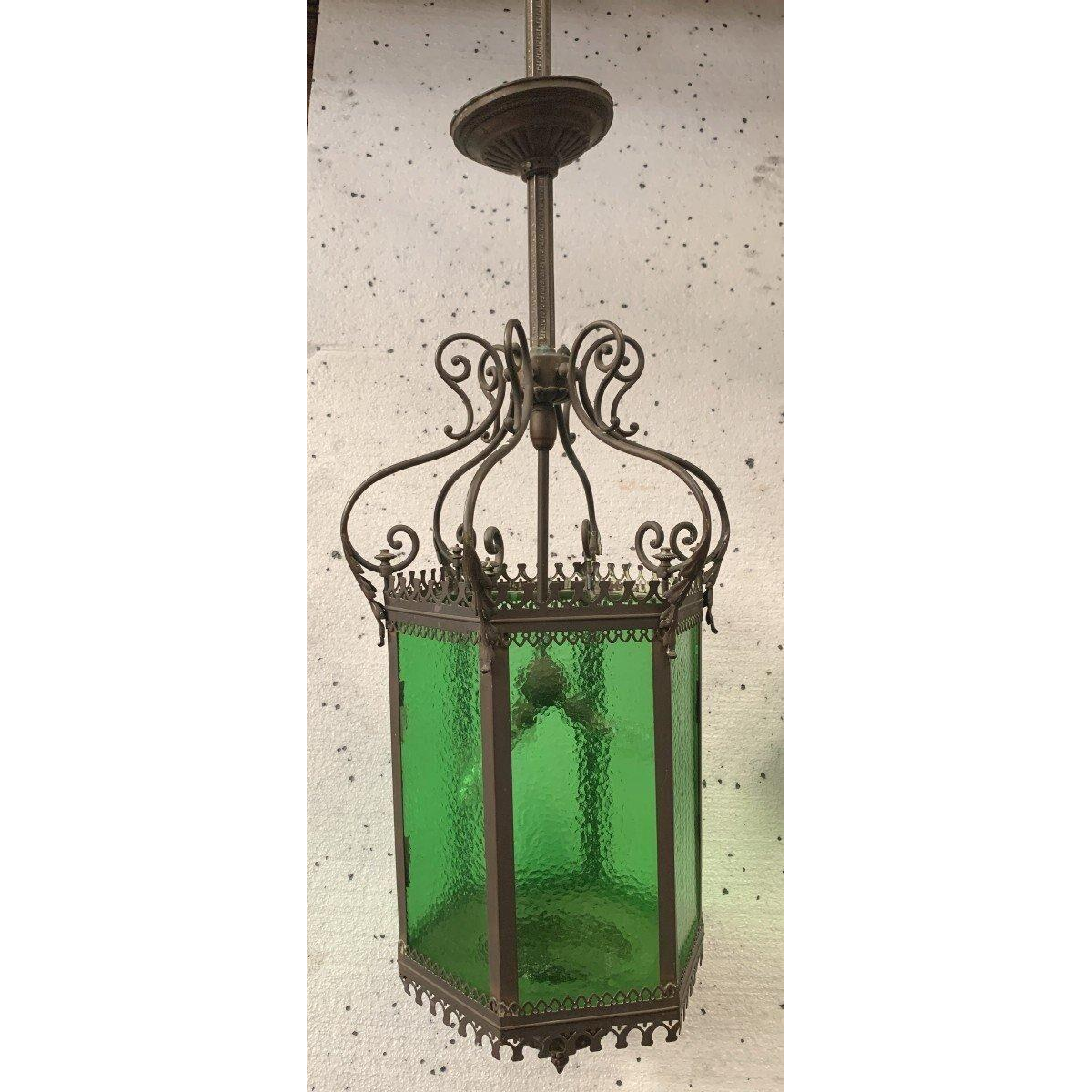 Zeshoekige vestibulelantaarn. Frame van brons en gepatineerd messing, groen gegolfd glas.