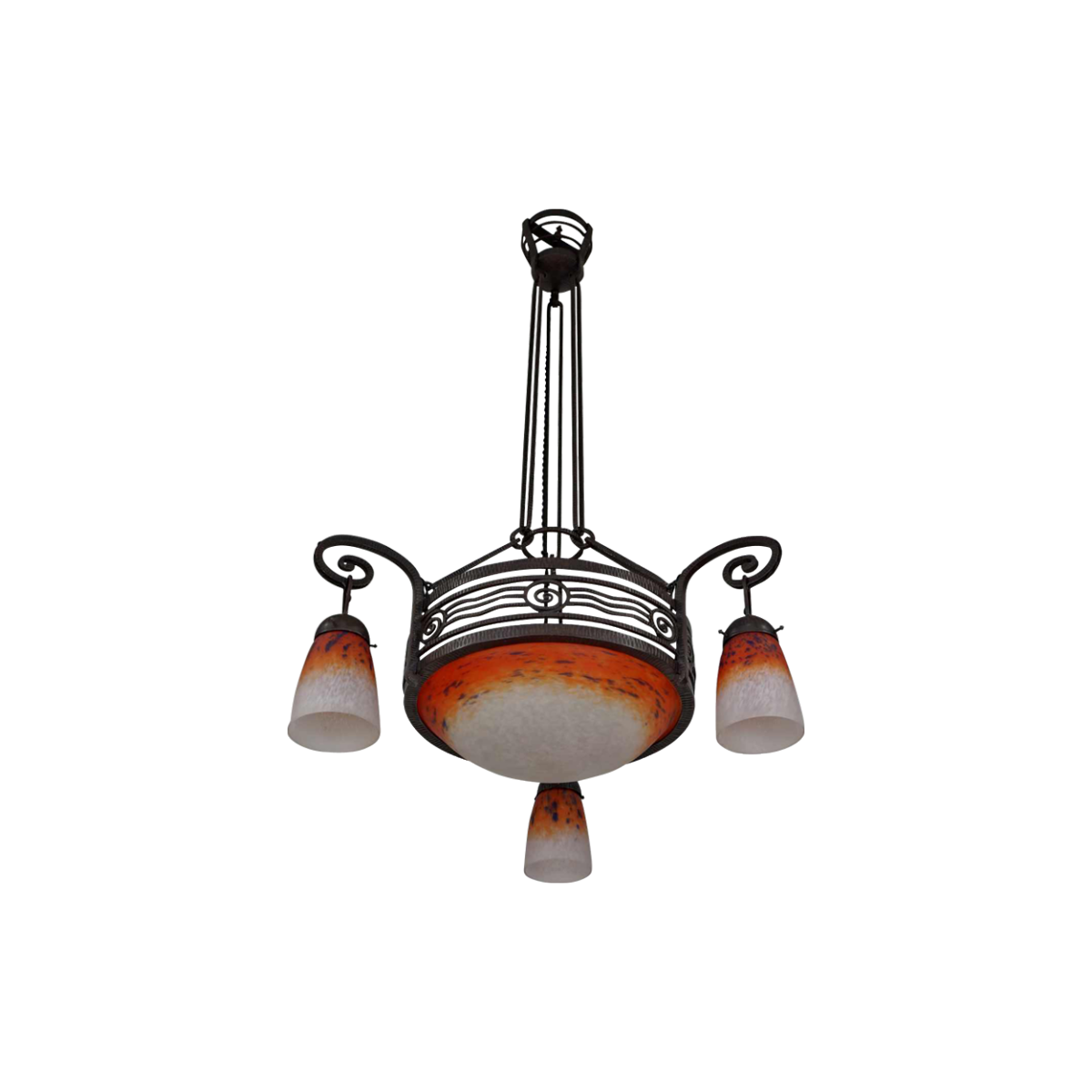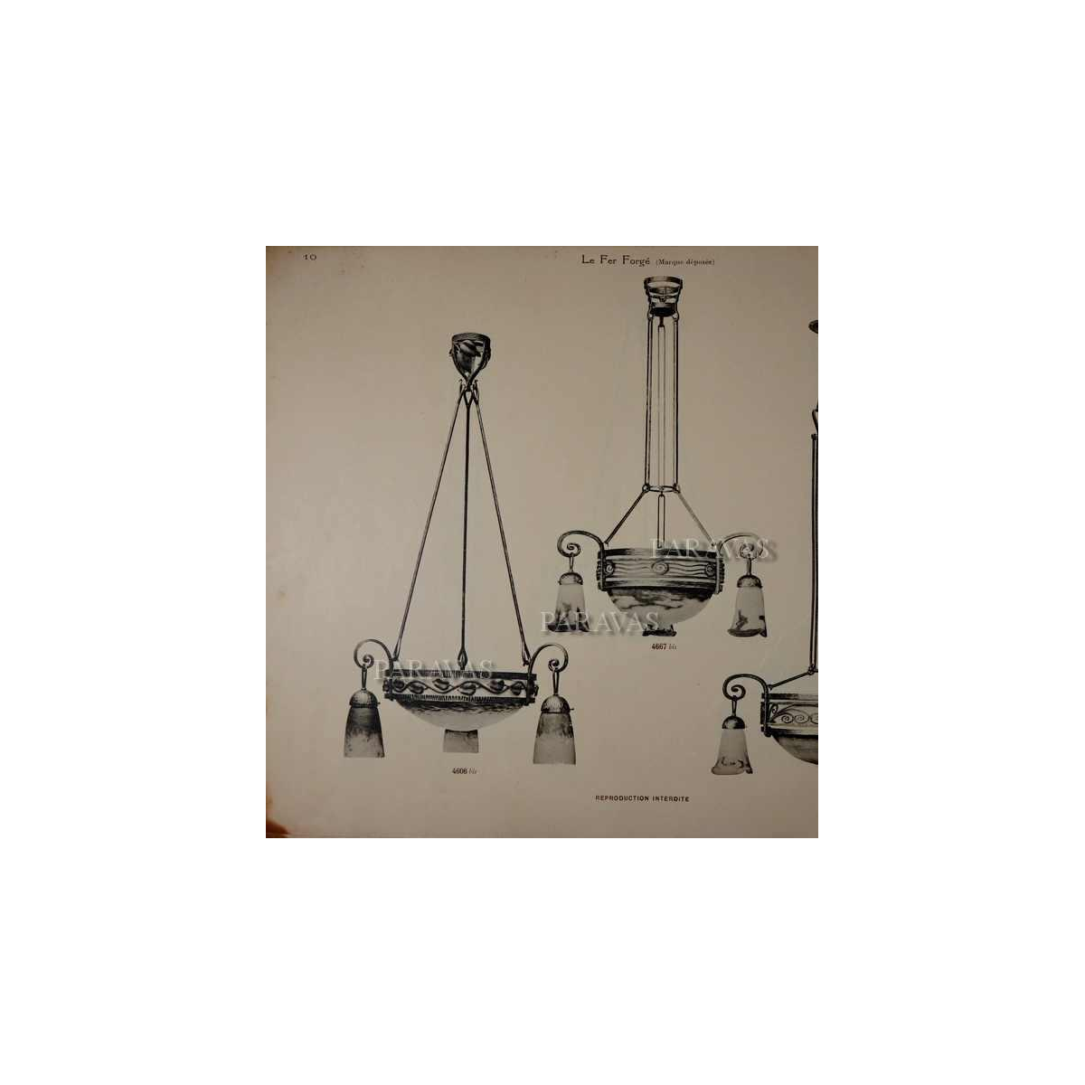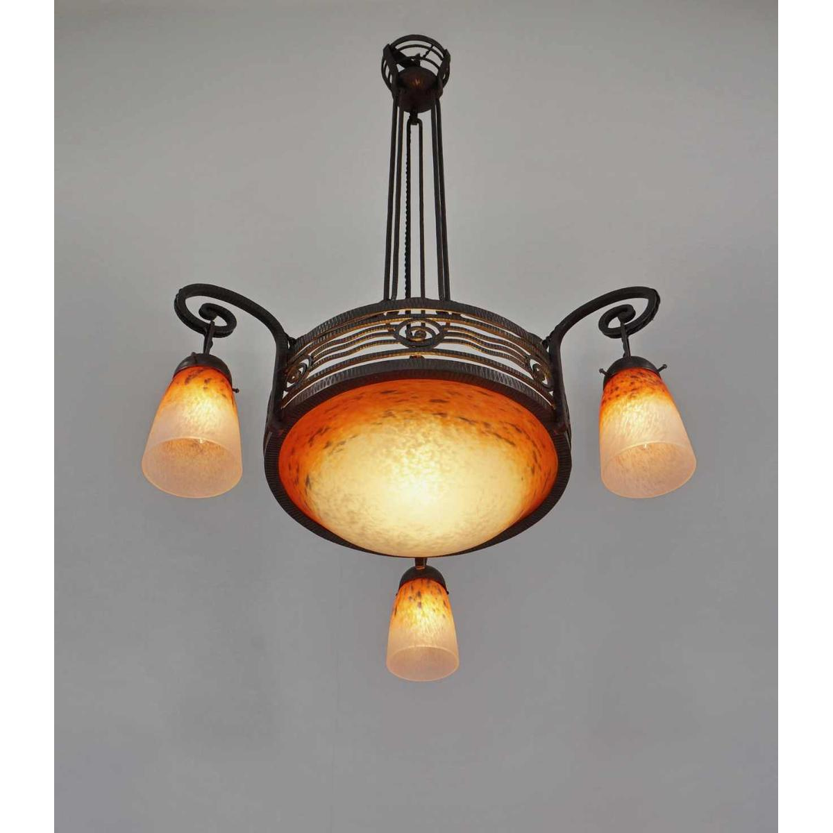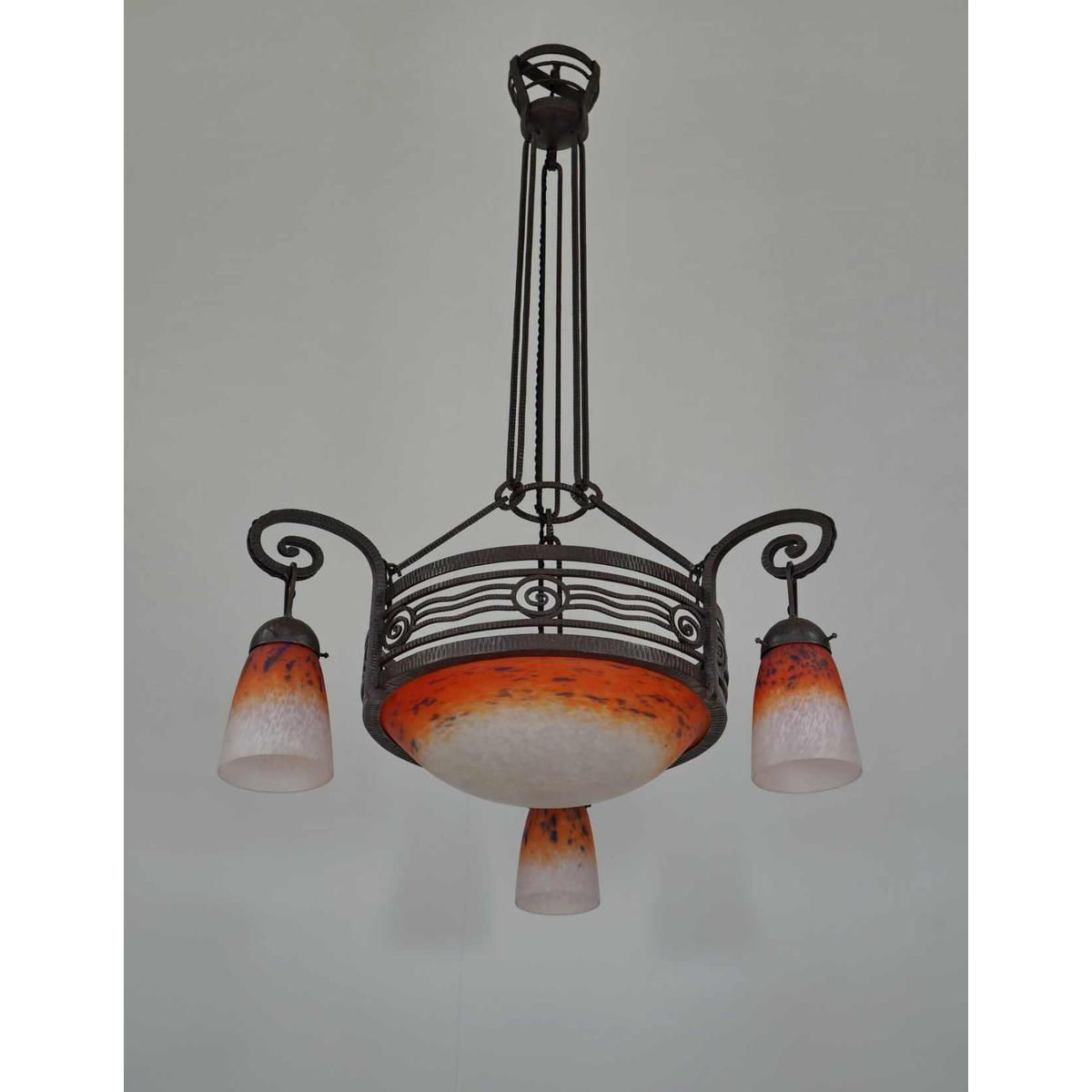Een grote Franse art deco kroonluchter van Le Fer Forgé H.F. het bedrijf van Henri Fournet te Lyon . Gemaakt rond 1925-1930 in smeedijzer en geperst glas. De lamp staat afgebeeld in de Fournet catalogus uit 1928. Het glaswerk werd gemaakt door Charles Schneider. De schaal en drie blakers zijn gesigneerd.