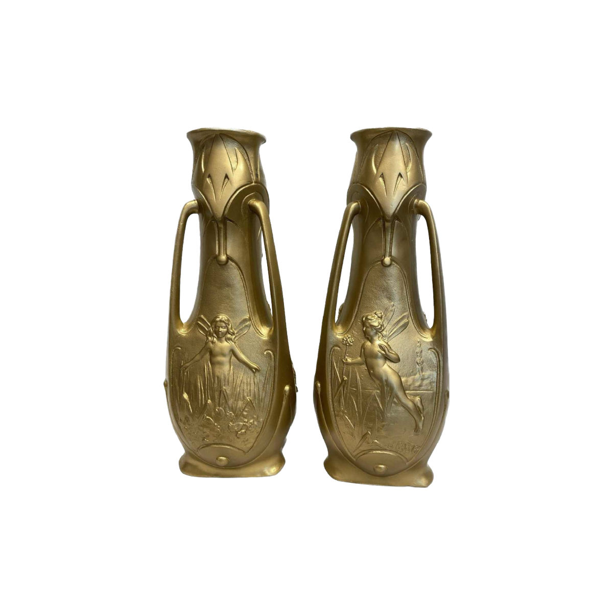 Vergulde regula vazen, gesigneerd Jean Garnier. Een paar Art Nouveau tinnen vazen met een verguld bronzen patina en nimfen in laag reliëf op een bucolische achtergrond, met 3 afneembare handvaten aan de zijkant. Gesigneerd Jean Garnier, circa 1900. In zeer goede staat. Hoogte: 31cm Jean Garnier werd in 1853 in Frankrijk geboren en stierf rond 1910. Werken van de kunstenaar zijn 291 keer openbaar geveild, voornamelijk in de categorie Sculptuur-Volume. De oudste geregistreerde verkoop vond plaats in 1991 bij Sotheby's.