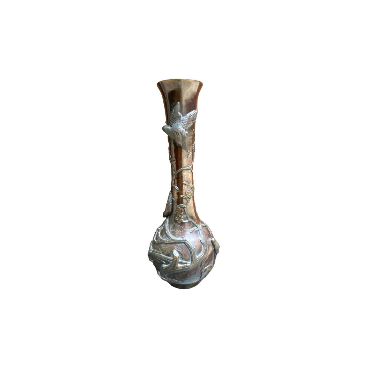 Japanse bronzen vaas gedecoreerd met vogels en bladeren, eind 19e eeuw