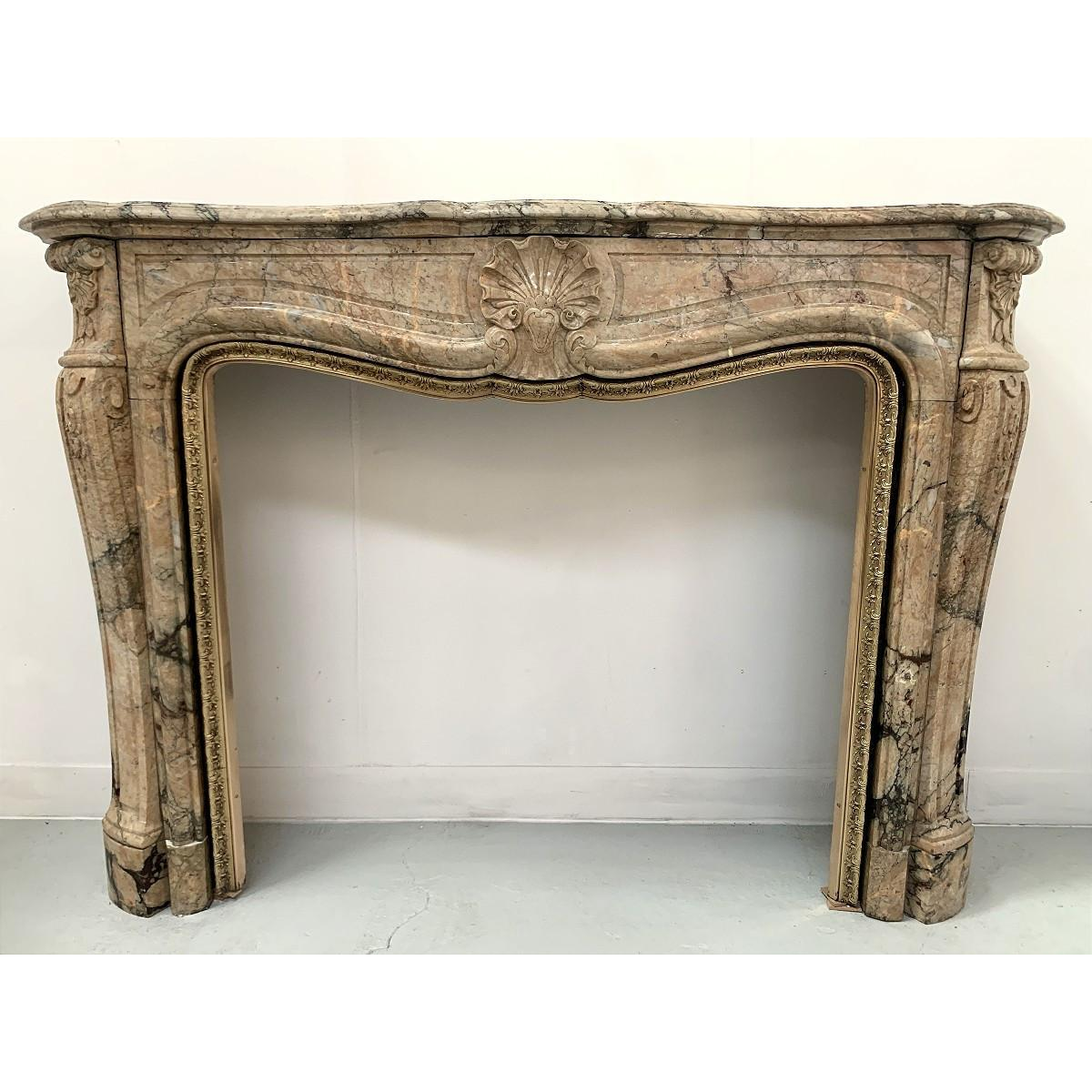 Open haard in Louis XV-stijl, uitgevoerd in breccia-marmer.