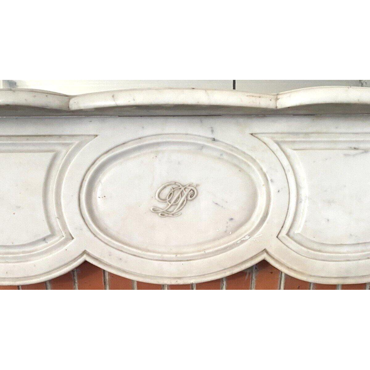 Een pompodoor-openhaard in Louis XV-stijl, uitgevoerd in wit geaderd marmer.