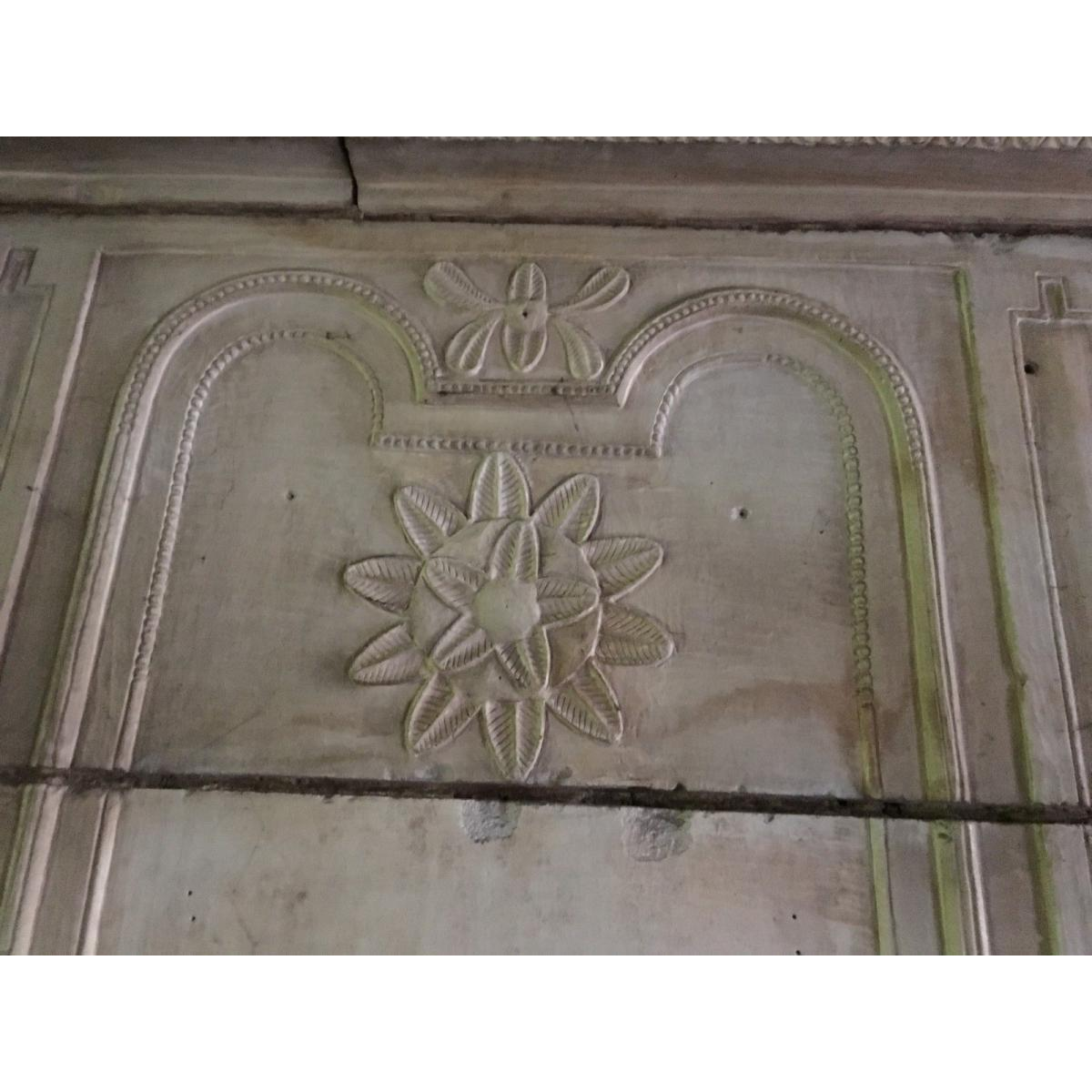 Trumeau is versierd met een grote, gebeeldhouwde rozet.