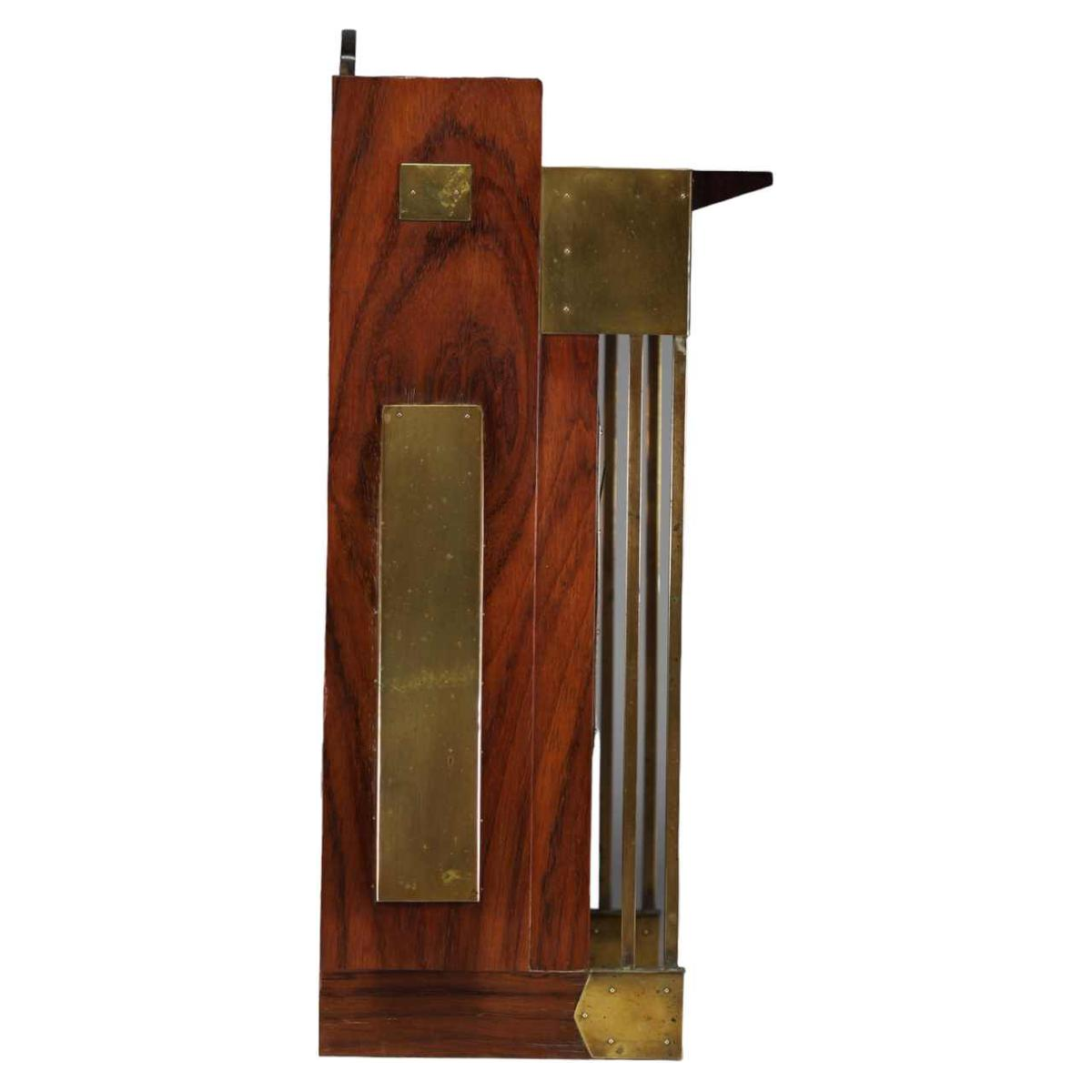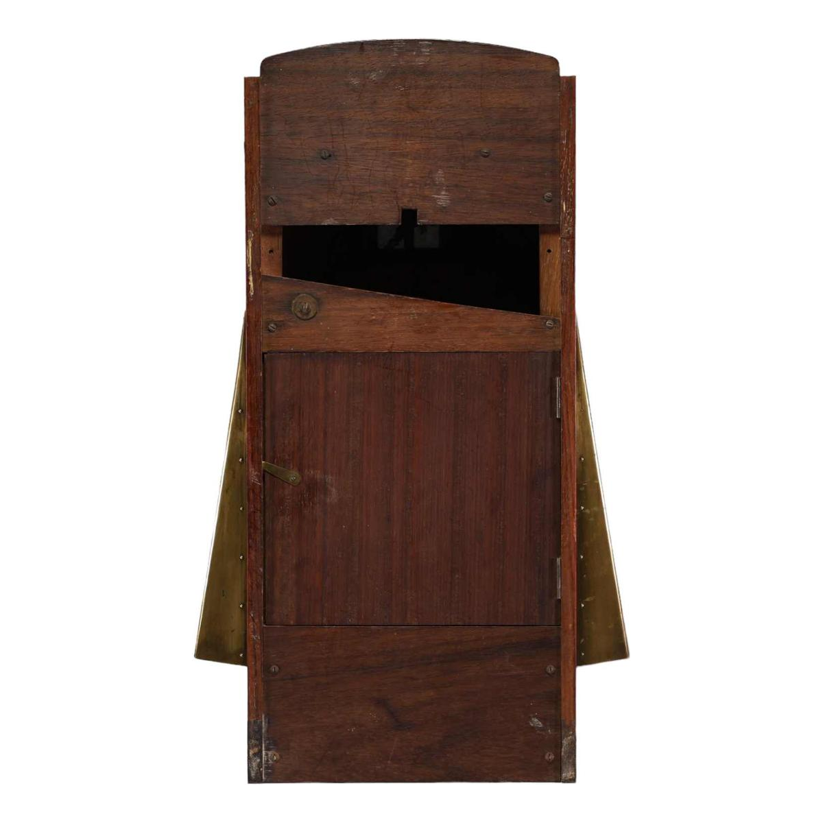 Mahonie, messing, beschilderd ijzer, glaspasta.