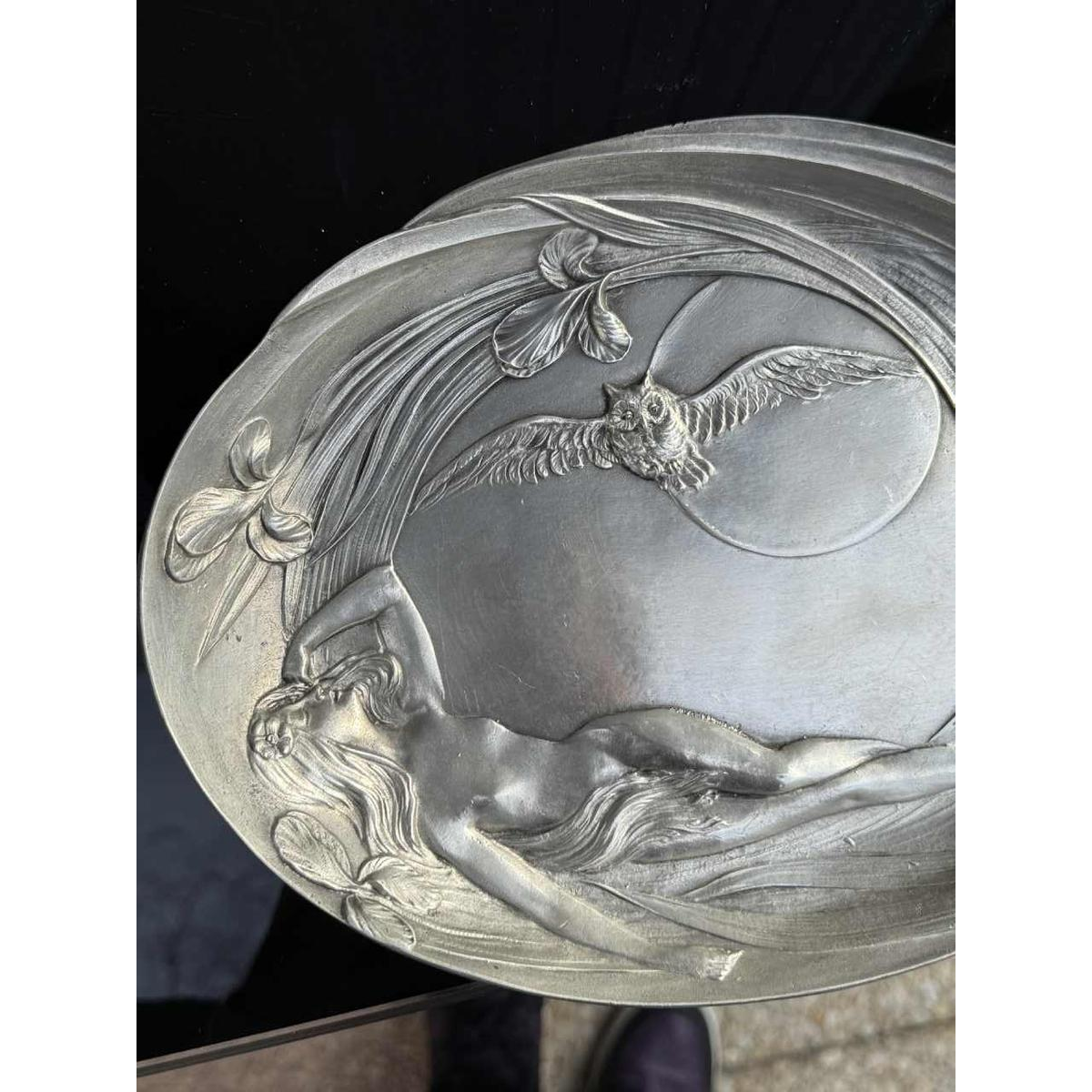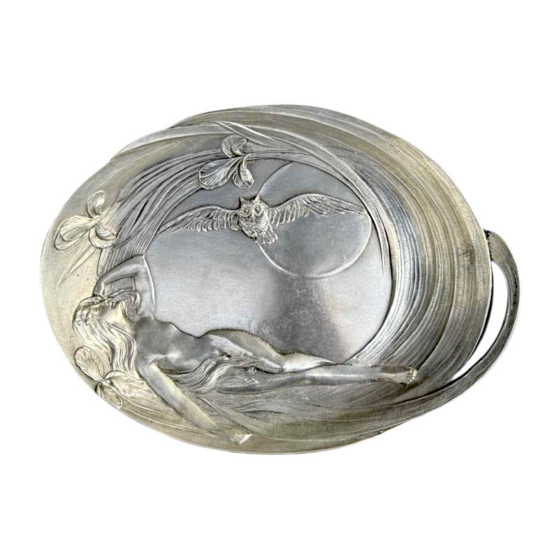 Achille Gamba 'Femme nue et chouette' Art Nouveau tinnen bord, ca 1900
