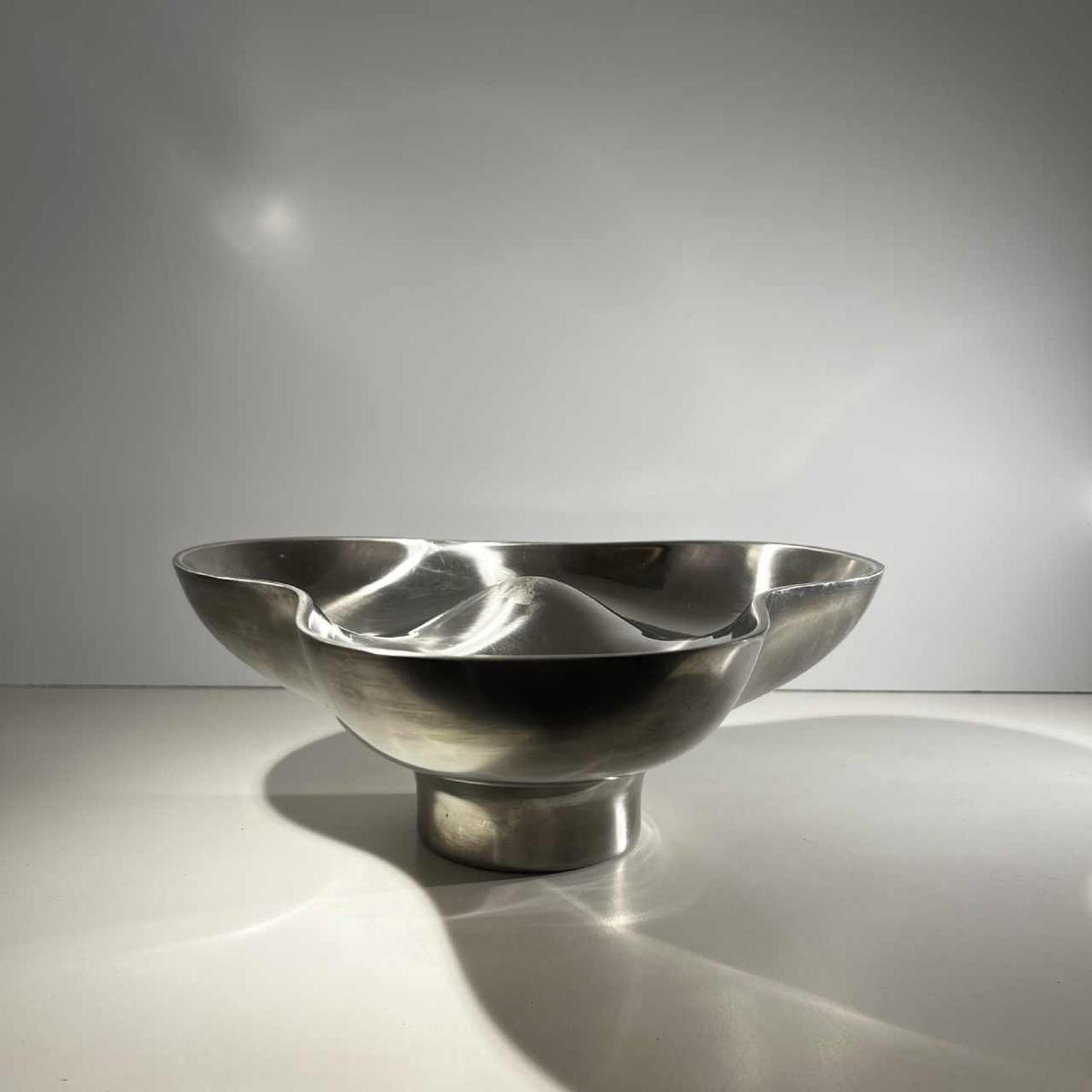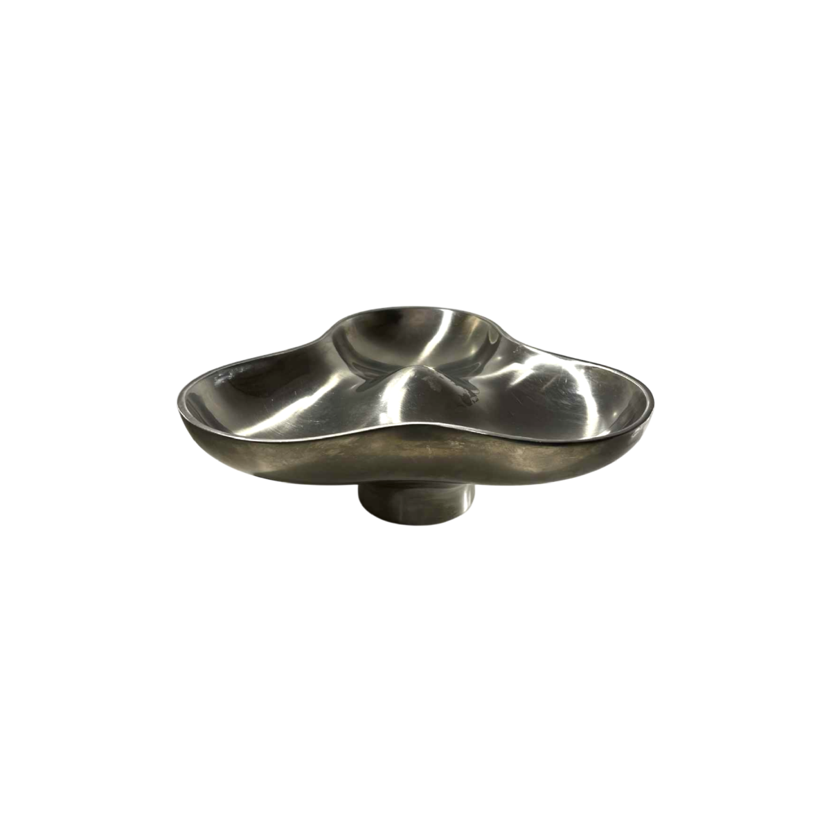 Grote serveerschaal of centerpiece op een ronde voet, de kom gevormd door drie afgeronde holtes die samenkomen in een vloeiende, organische compositie. Het gepolijste oppervlak weerkaatst het licht en benadrukt de zuiverheid van de lijnen.