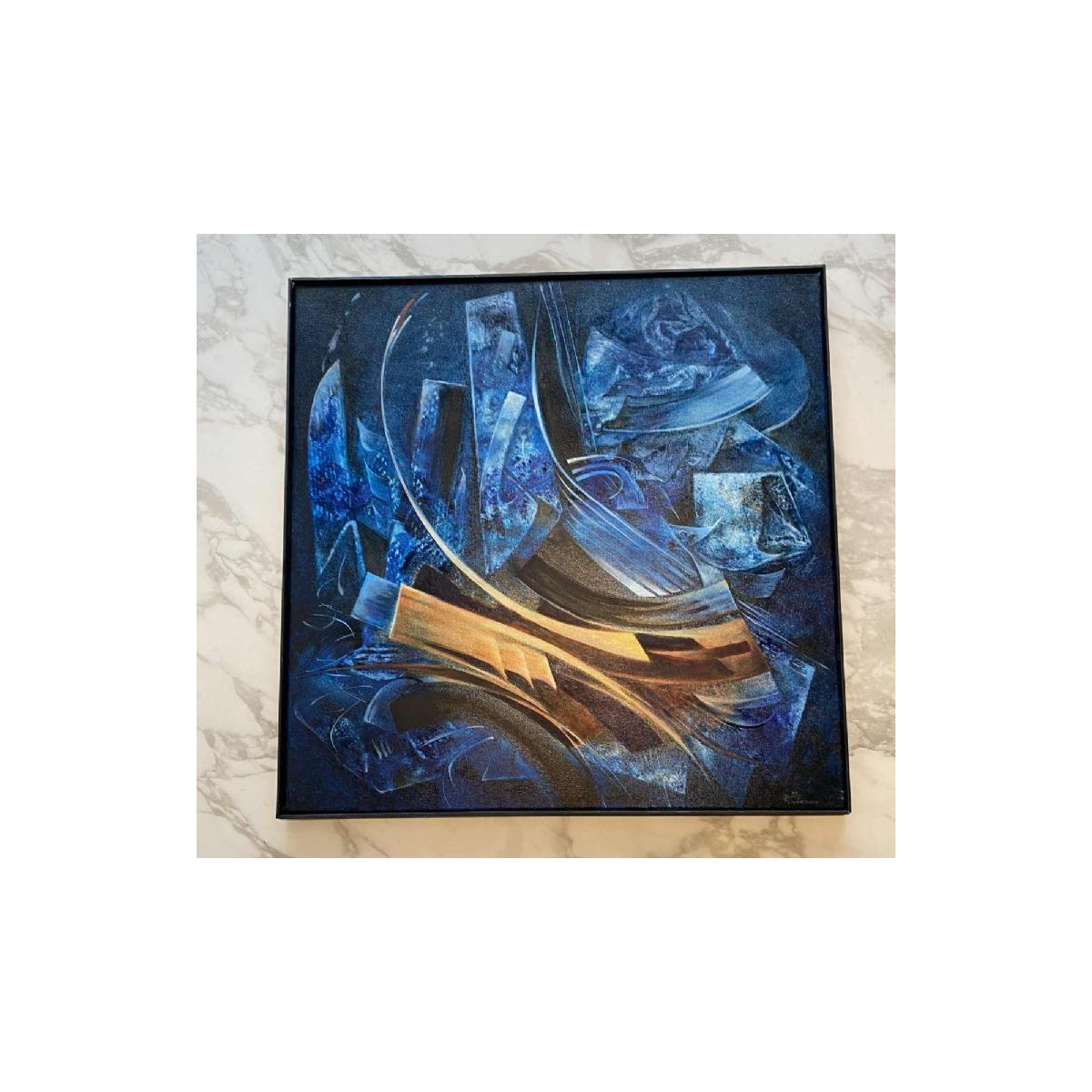 Olieverf op doek, in donkerblauwe en oranje tinten. Abstract schilderij. Aan beide zijden gesigneerd en gedateerd juni 2009.