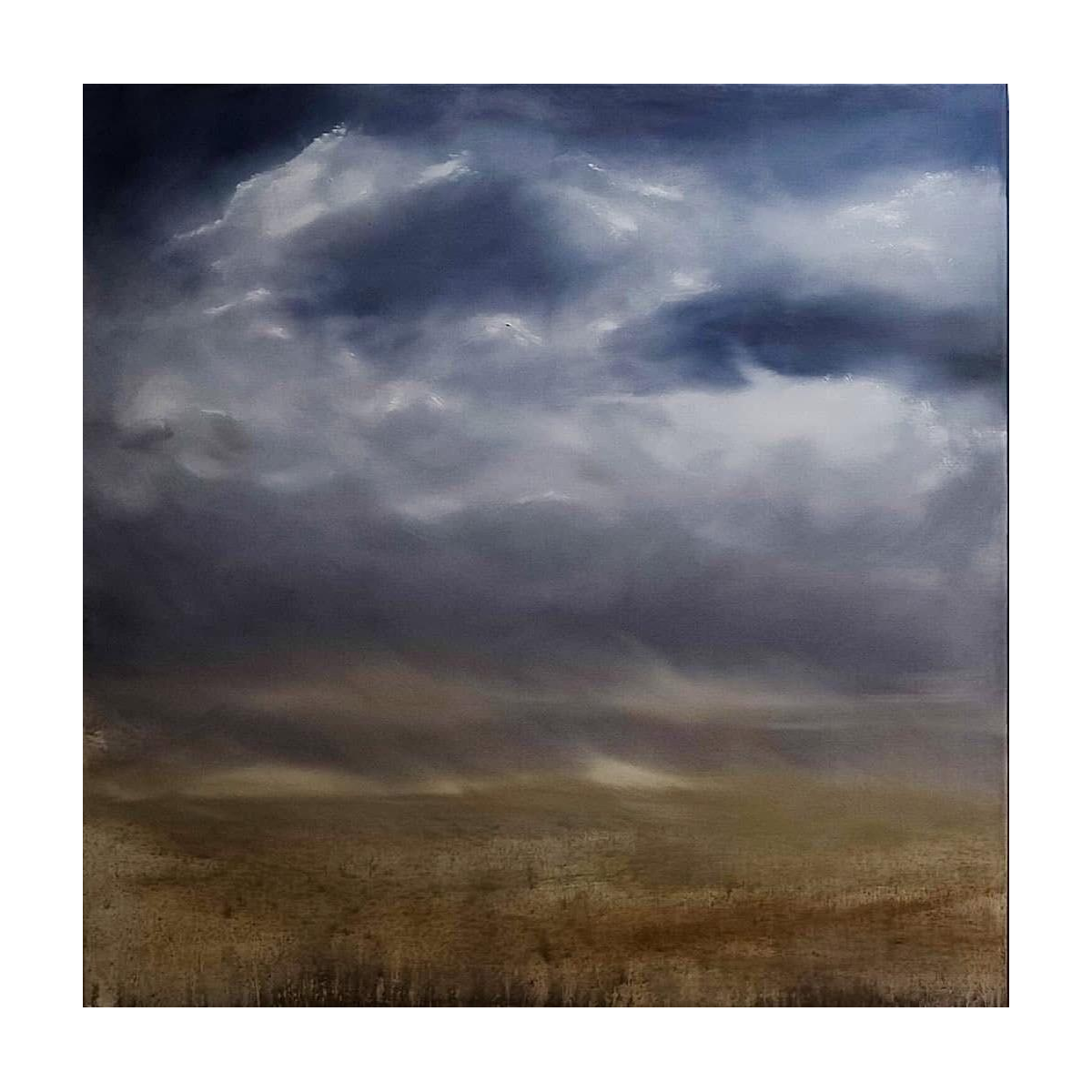Onder een zware hemel zoekt het licht zijn weg. De aarde houdt haar adem in, zwevend tussen schaduw en licht.