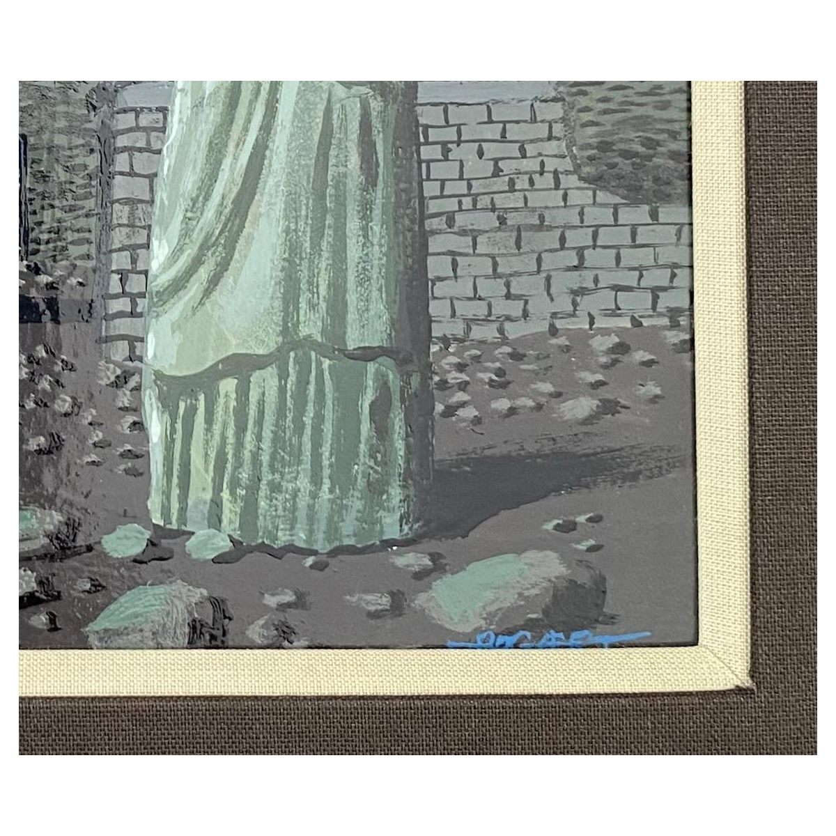 Blauwe lijst, passend bij het onderwerp, die enkele krasjes vertoont.