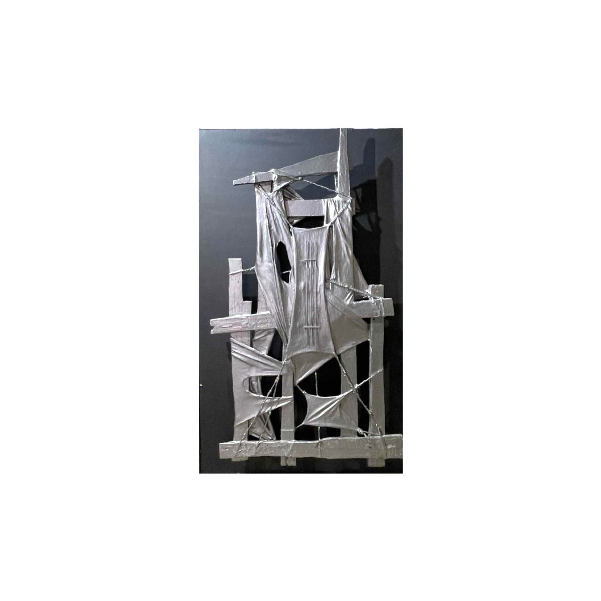 MACKOWIAK ERWIN, abstracte gemengde techniekcompositie uit 1963, olieverf op paneel, assemblage van touwen, stof en beschilderd hout los van de achtergrond (spaanplaatpaneel). Doeken van stof gespannen met touwen (een beetje zoals zeilen), aluminiumkleurig op een matzwarte achtergrond.