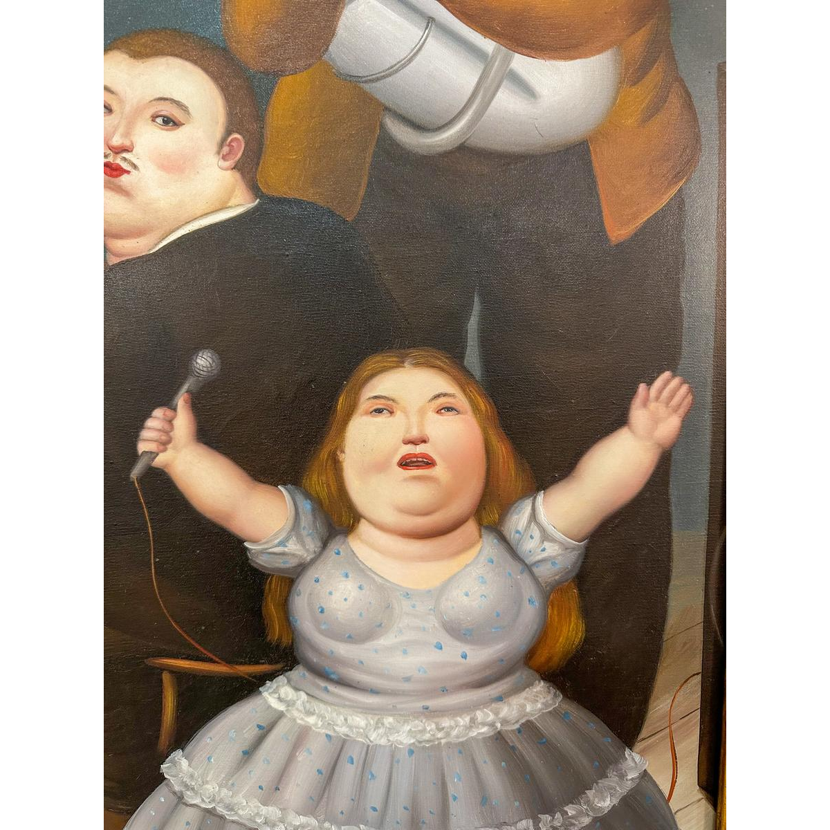 Olieverf op doek, geïnspireerd op het werk van Fernando Botero. Geboren in Colombia in 1932, staat hij bekend om zijn ronde en weelderige figuren, geïnspireerd op de precolumbiaanse kunst.