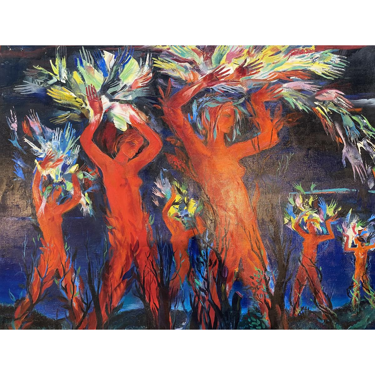 Olieverf op doek, zonder titel, voorstellend de dans van rode “boom-vrouwen” met veelkleurige bladeren tegen een nachtblauwe achtergrond.