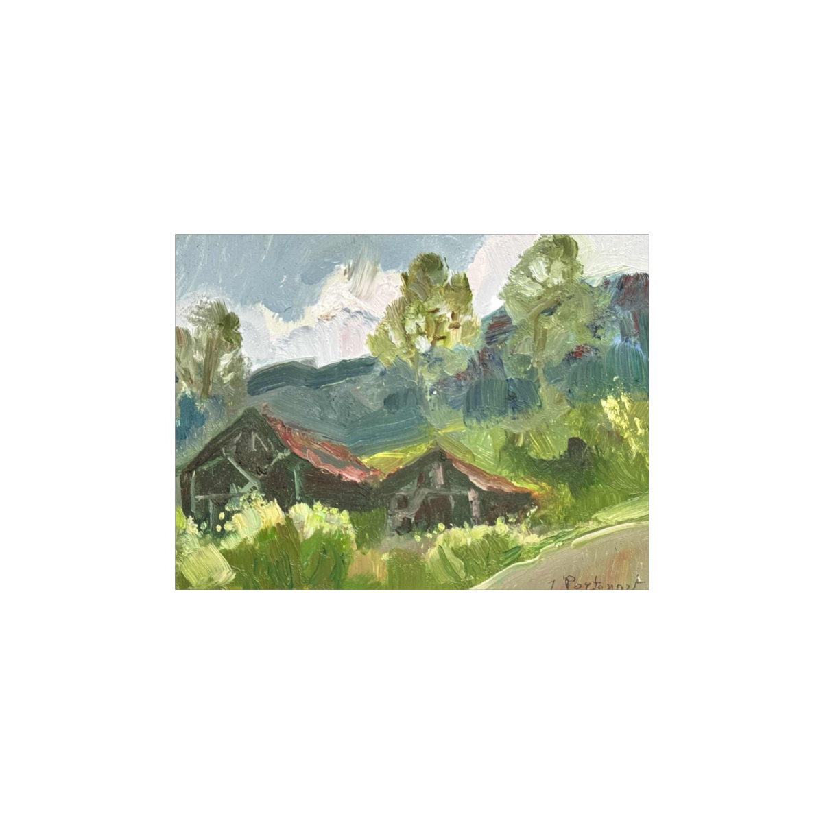 Jeanne PORTENART « Tabaksdrogers op de weg van Membre-sur-Semois » schilderij olieverf op paneel