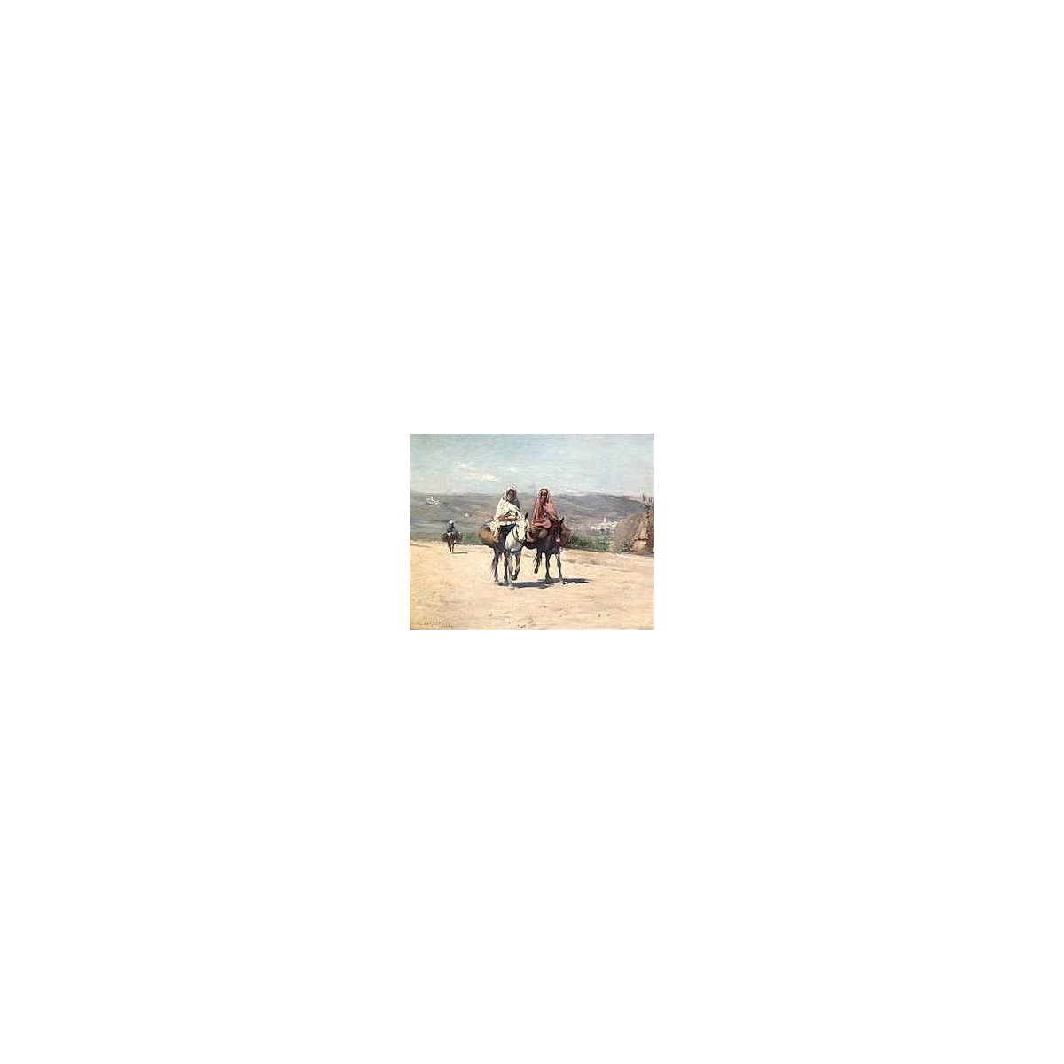 Frantz Charlet was een van de beste vertegenwoordigers van het Belgisch oriëntalisme. Hij was goed bevriend met Théo van Rysselberghe en creëerde samen met hem en James Ensor, onder leiding van Octave Maus, de XX. Dit schilderij, gesigneerd (linksonder) F. Charlet, bevindt zich in Algiers. Het toont een mooi Noord-Afrikaans woestijnlandschap met “ruiters“ die op ezels of muilezels rijden. De gekozen tinten en het spel van schaduwen geven een indruk van de overweldigende hitte die typisch is voor de woestijn. De amazone rechts rookt, een grappig detail dat de kunstenaar heel goed heeft gedaan.