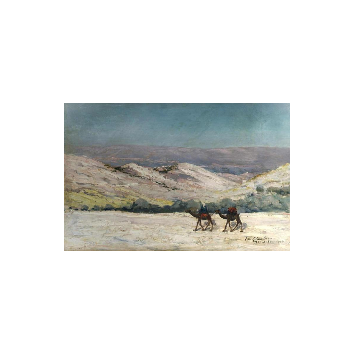 Tijdens een reis naar het Midden-Oosten en Klein-Azië schilderde de kunstenaar een berglandschap aan de rand van Jeruzalem, met een kameeldrijver op een dromedaris die een tweede dromedaris achter zich aan sleept. De keuze van de kleuren en de helderheid van dit schilderij geven het diepte en een zeer interessant perspectief.
