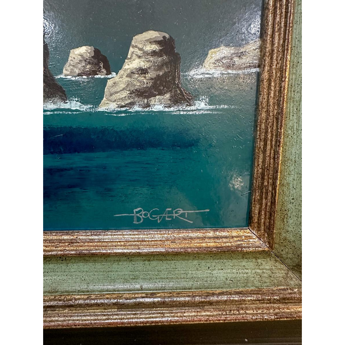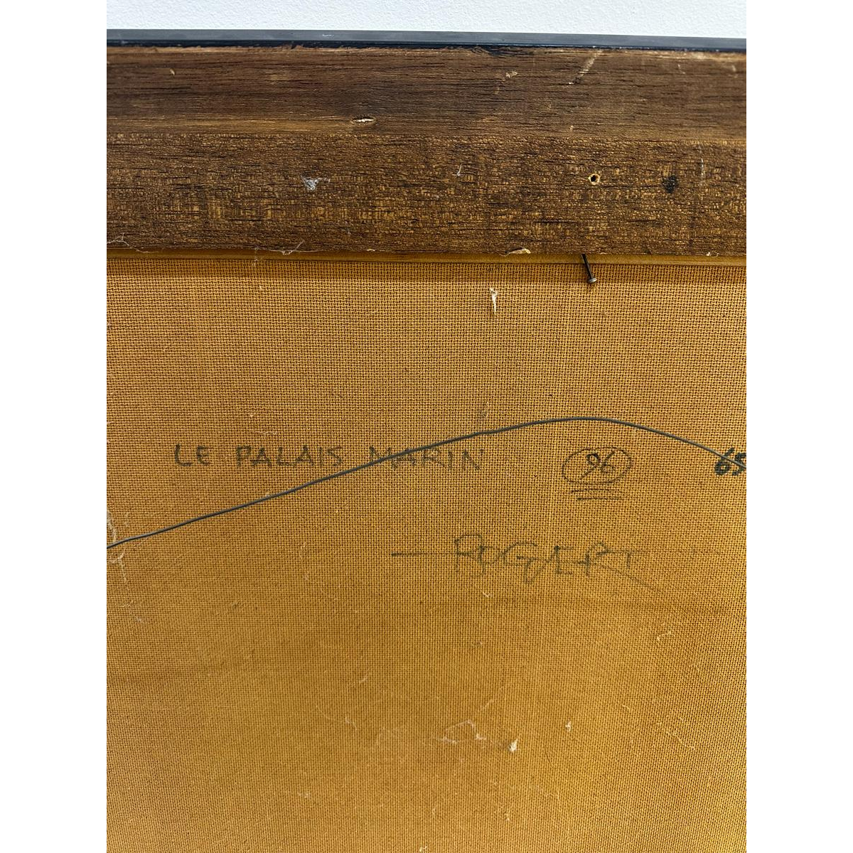 Olieverf op doek, "Le Palais Marin", gesigneerd door Bogaert en gedateerd 1996. Bogaert is een Frans-Belgische schilder en schrijver die werkt in een symbolistische en surrealistische stijl. Zijn schilderijen weerspiegelen zijn zeer persoonlijke visie op de onwerkelijke, dromerige en fantasierijke wereld, die een mysterieuze spanning of een beklemmend gevoel van dreigende dreiging creëert.