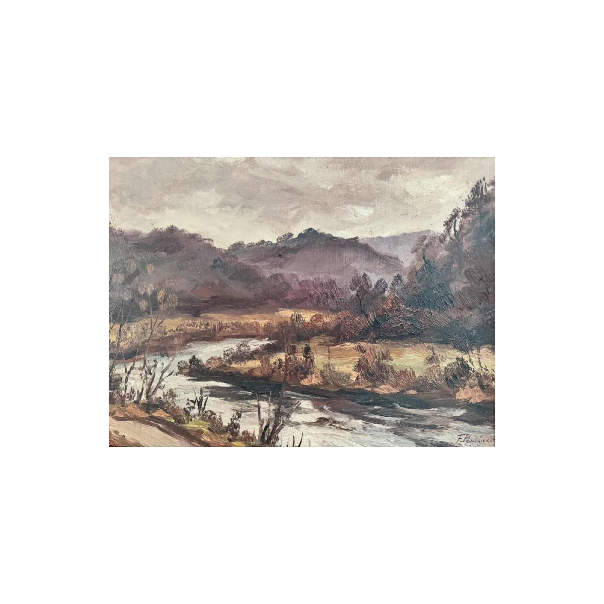 'Fernand Joseph PONTHIER werd op 29 maart 1885 geboren in Comblain-au-Pont (BE) en overleed op 20 november 1952 in Hamoir (BE), waar hij zijn woonplaats had gekozen. Geïnspireerd en getraind door Richard Heintz, met wie hij bevriend werd, was hij gepassioneerd door de schilderkunst die hij van 1914 tot zijn dood in 1952 intensief beoefende. Net als andere weinig bekende kunstenaars die het advies kregen van de 'Master of Sy', zoals Albert Sirtaine, Georges Ista, Elysée Fabry, Arthur Zeippen en Pol-François Mathieu, behoort Fernand Ponthier tot de informele école lieugeoise du paysage, een uitdrukking die soms wordt gebruikt door post-impressionistische, voornamelijk landschapsschilders, van de late 19e eeuw tot het midden van de 20e eeuw. In die zin koos de kunstenaar uit Hamoi ervoor om in de marge te blijven van de grote stromingen die de schilderkunst in de decennia waarin hij zijn kunst beoefende, zoals fauvisme, expressionisme, kubisme, surrealisme, enz. Hij beperkte zijn uitgebreide productie tot olieverfschilderijen en zeldzame aquarellen en gouaches. Hij lijkt de tekening alleen uitzonderlijk te hebben benaderd. Zijn favoriete onderwerpen zijn het wildwater en de rotsen van de rivieren van Luik, met name de Ourthe en haar zijrivieren, de Fagne, de Haute Ardennen en tijdens de vakantie het landschap van Zuid-Frankrijk. Hij hield zich ook bezig met wonen, met name vakwerkhuizen, kapellen, molens en regionale boerderijen. Ponthier liet zich duidelijk inspireren door de techniek met grote accenten van Heintz, maar is geenszins een pure kopieerder. Hij heeft een interessante artistieke persoonlijkheid ontwikkeld. Zijn kleuren hebben zelden de intensiteit en het licht van die van zijn mentor. Zijn schilderijen zweten niet zo uitbundigheid. Het was de emotie van het landschap, met een sfeer die verandert met de seizoenen en de uren, die zijn draad van Ariane was. In zijn rivieren bijvoorbeeld wist hij de adem en grillen van het licht in de seizoenen fijn te vangen
