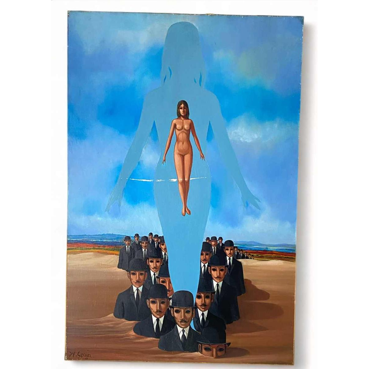 This form is only used to notify us of illegal content on product: Jean-Pierre Serrier 'La femme dominante' surrealistisch schilderij, olieverf op doek, 1969.