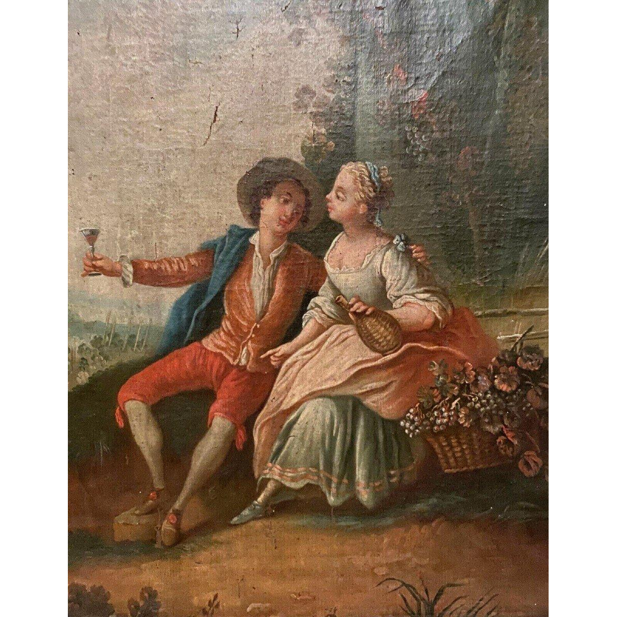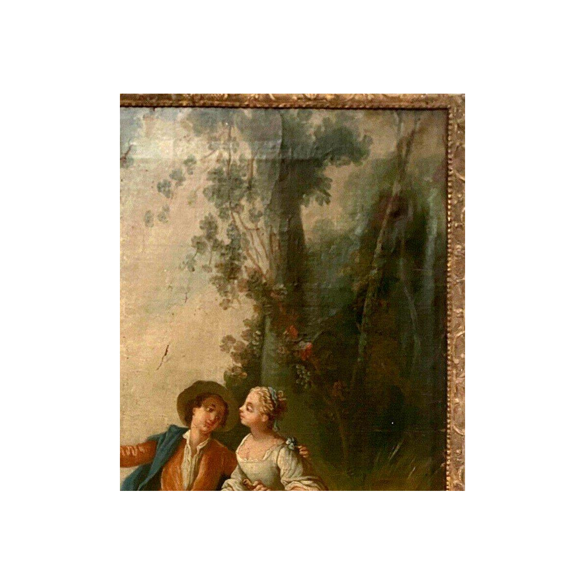 Olieverf op doek, voorstellende een romantische scène.