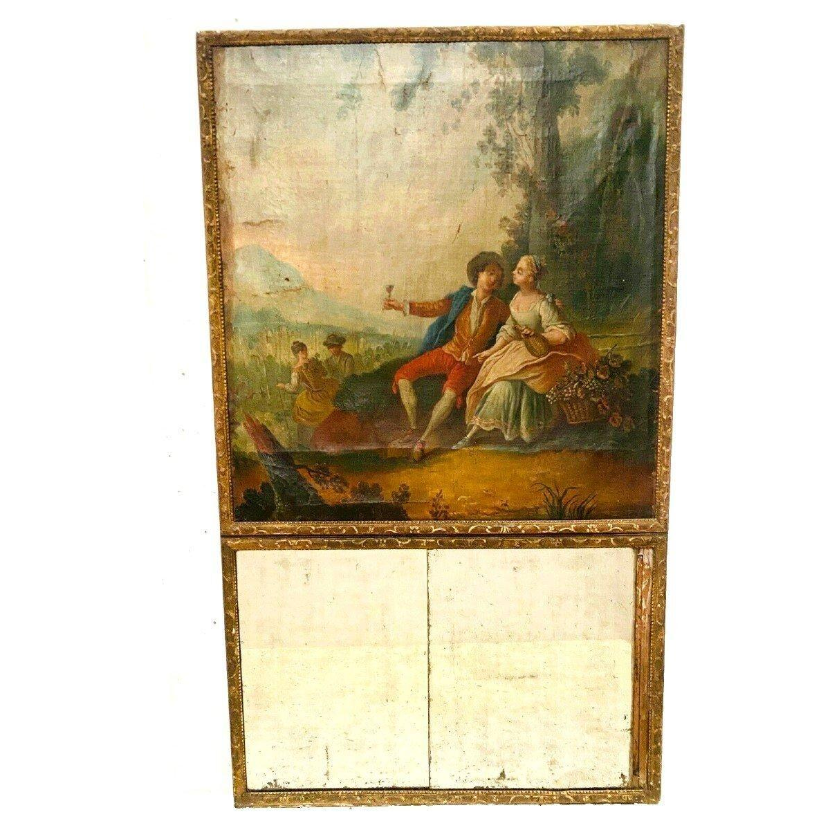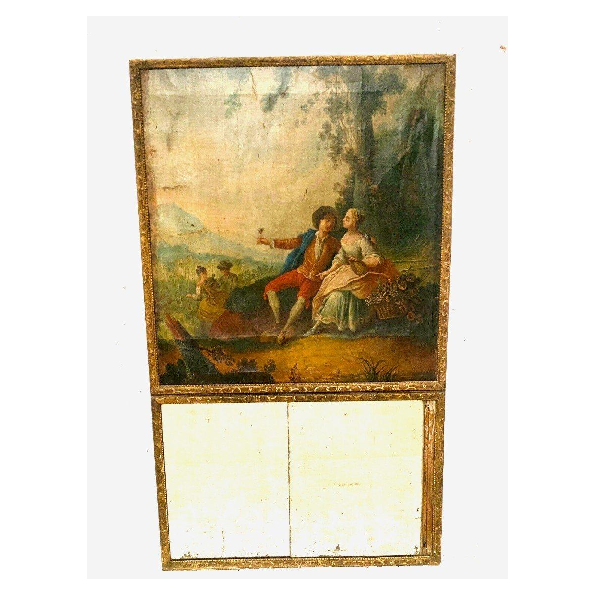 Trumeau-spiegel in Lodewijk XV-stijl "Romantische scène", gesneden hout, olieverf op doek, 19e eeuw