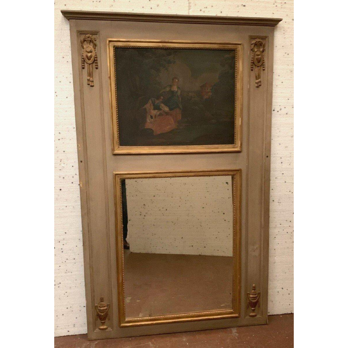 Trumeau-spiegel in Lodewijk XVI-stijl van gepatineerd en verguld hout, 20e eeuw.