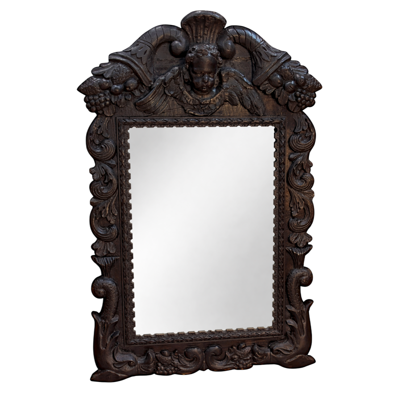Belangrijke ceremoniële spiegel van rijk bewerkt en gevormd eikenhout. Het fronton is in het midden voorzien van een hoogreliëf mascaron met een putto (of cherubijn) gezicht met vlezige gelaatstrekken, dat tevoorschijn komt uit een gestileerde schelp met uitgestrekte vleugels.