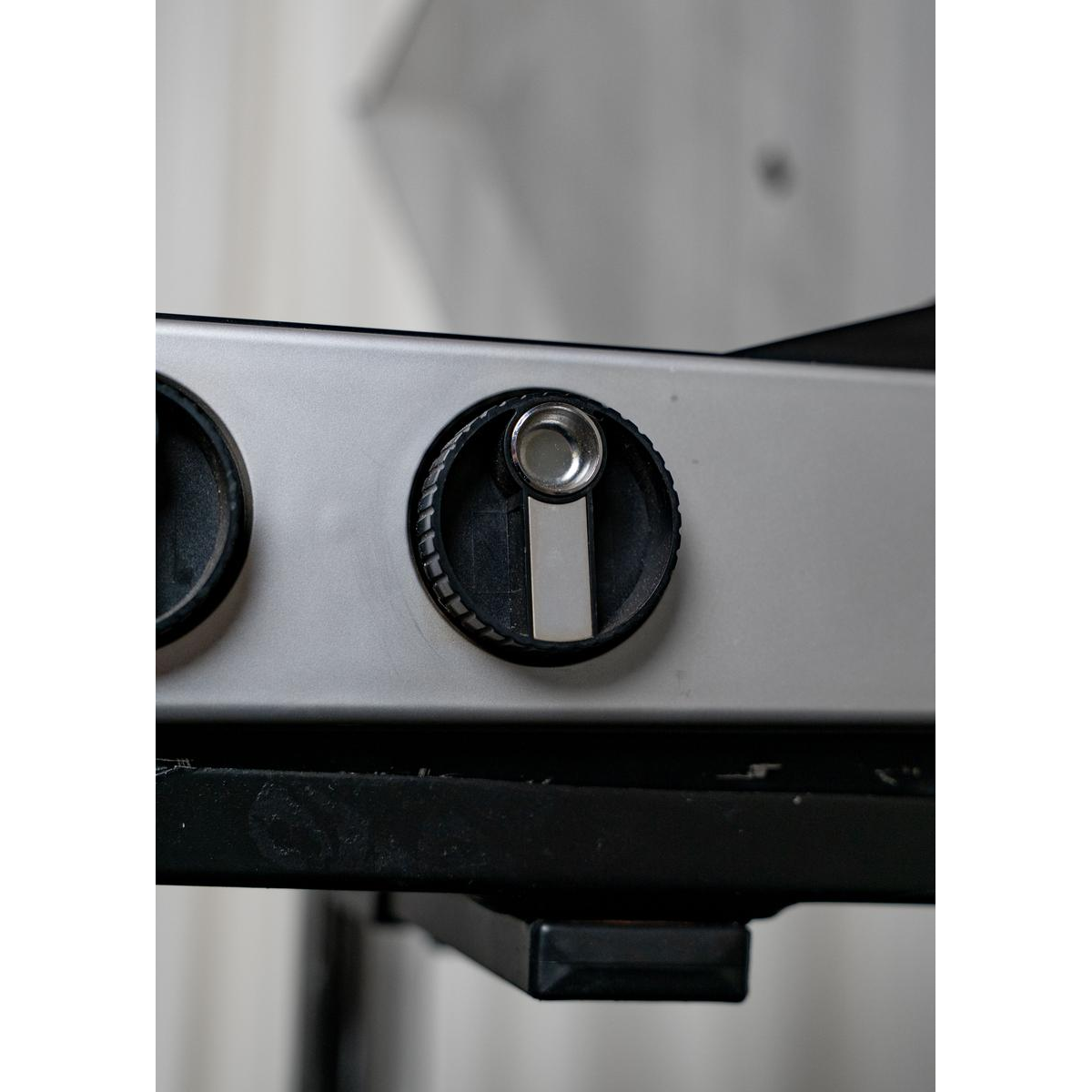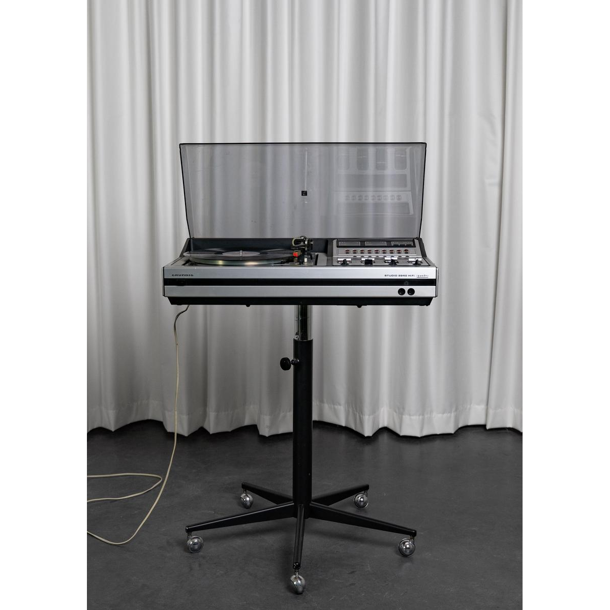 Deze hifi-studio wordt geleverd met een stervormig onderstel op wieltjes en verkeert in goede staat. Dit exemplaar vertoont tekenen van slijtage en patina die verband houden met leeftijd en gebruik, zoals krassen op de kunststof kap.