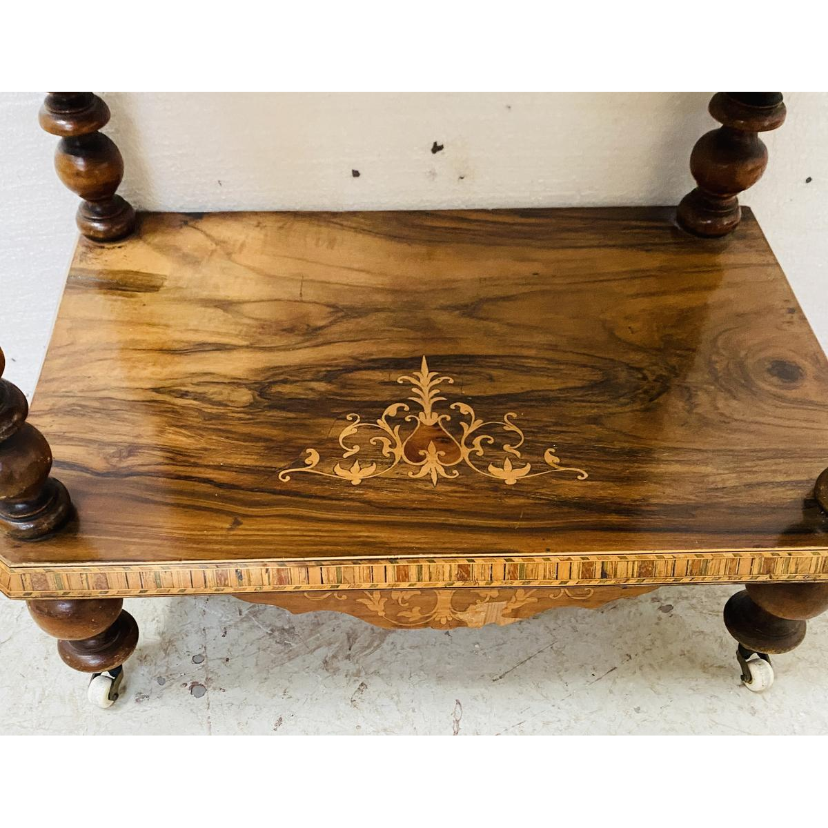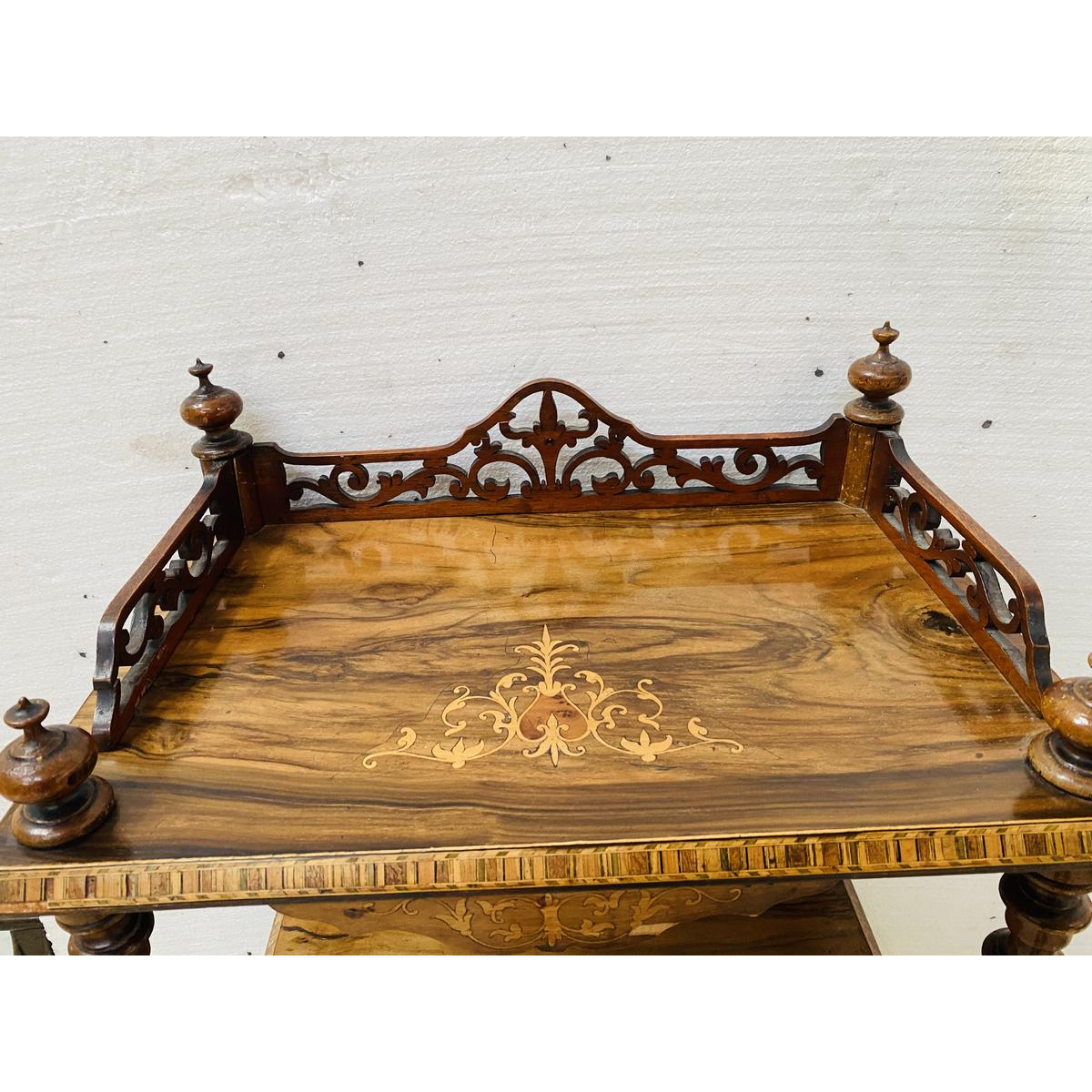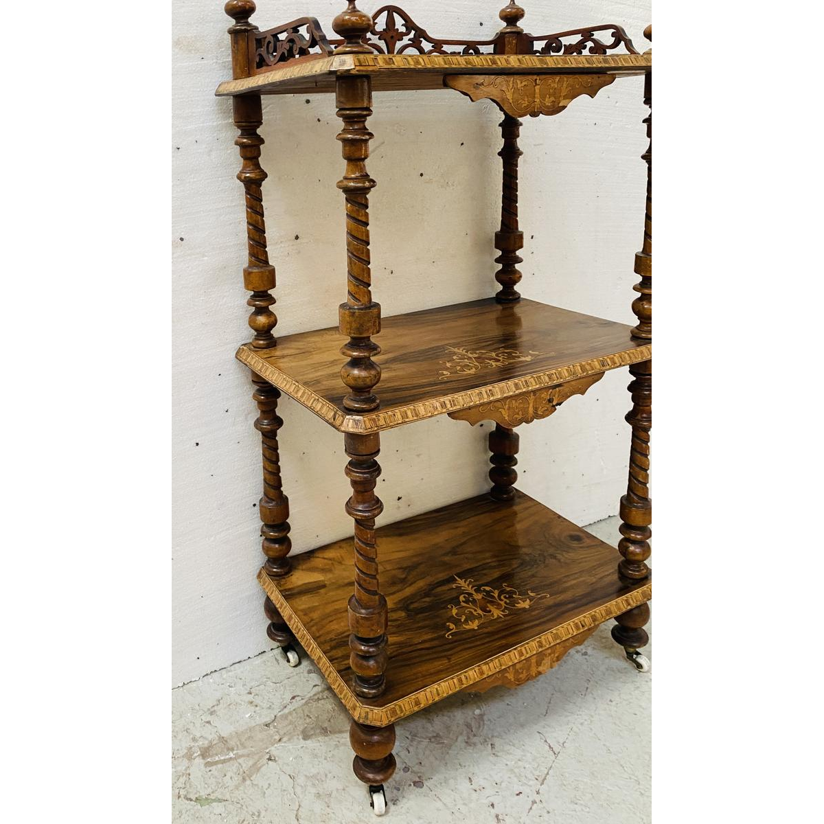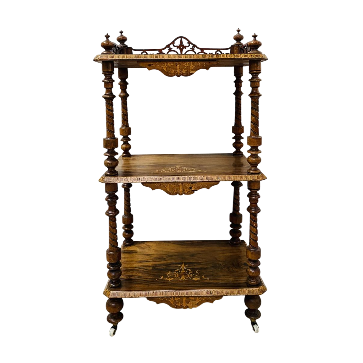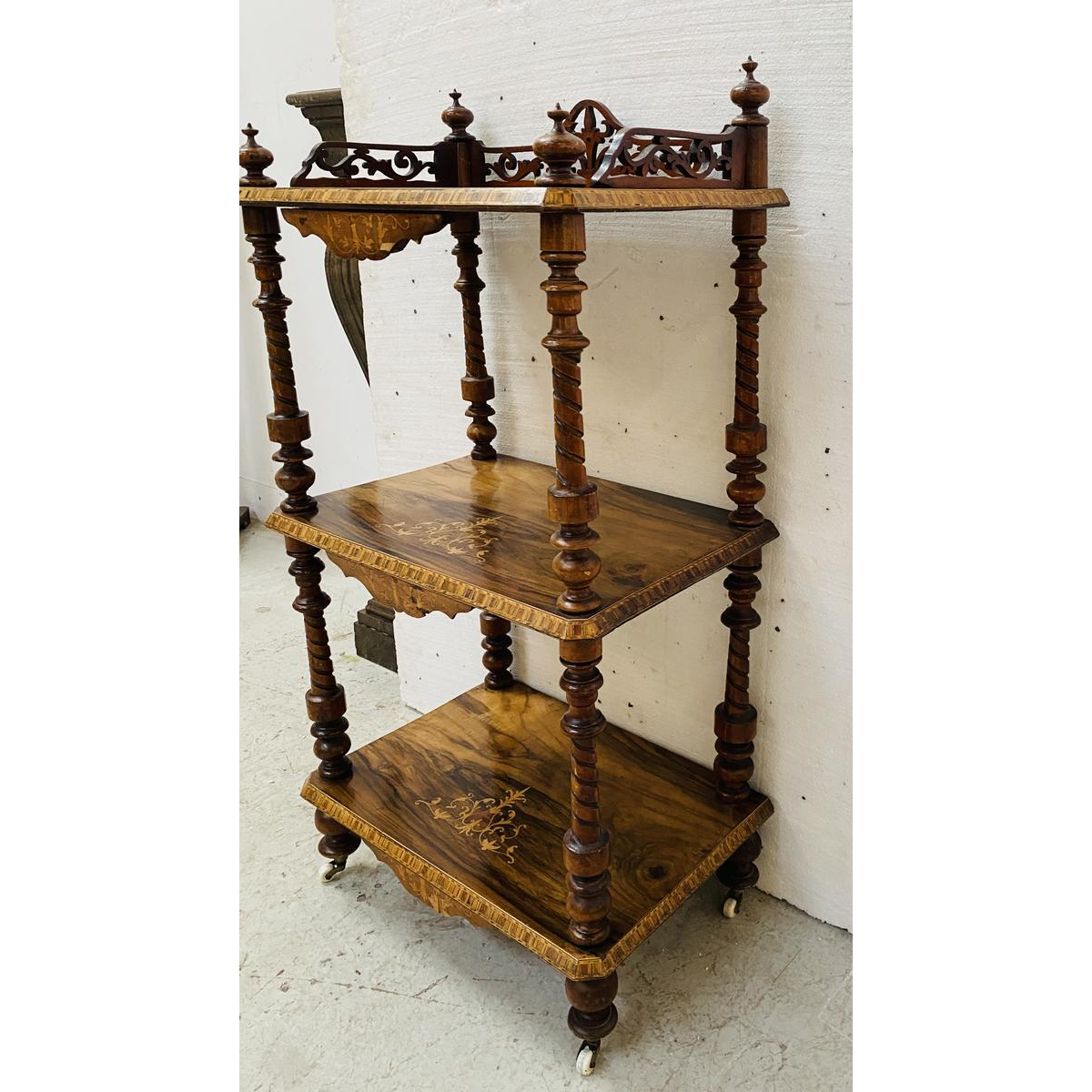 Drielaagse consoletafel uit de periode van Napoleon III, vervaardigd uit walnotenhout en versierd met marqueterie.