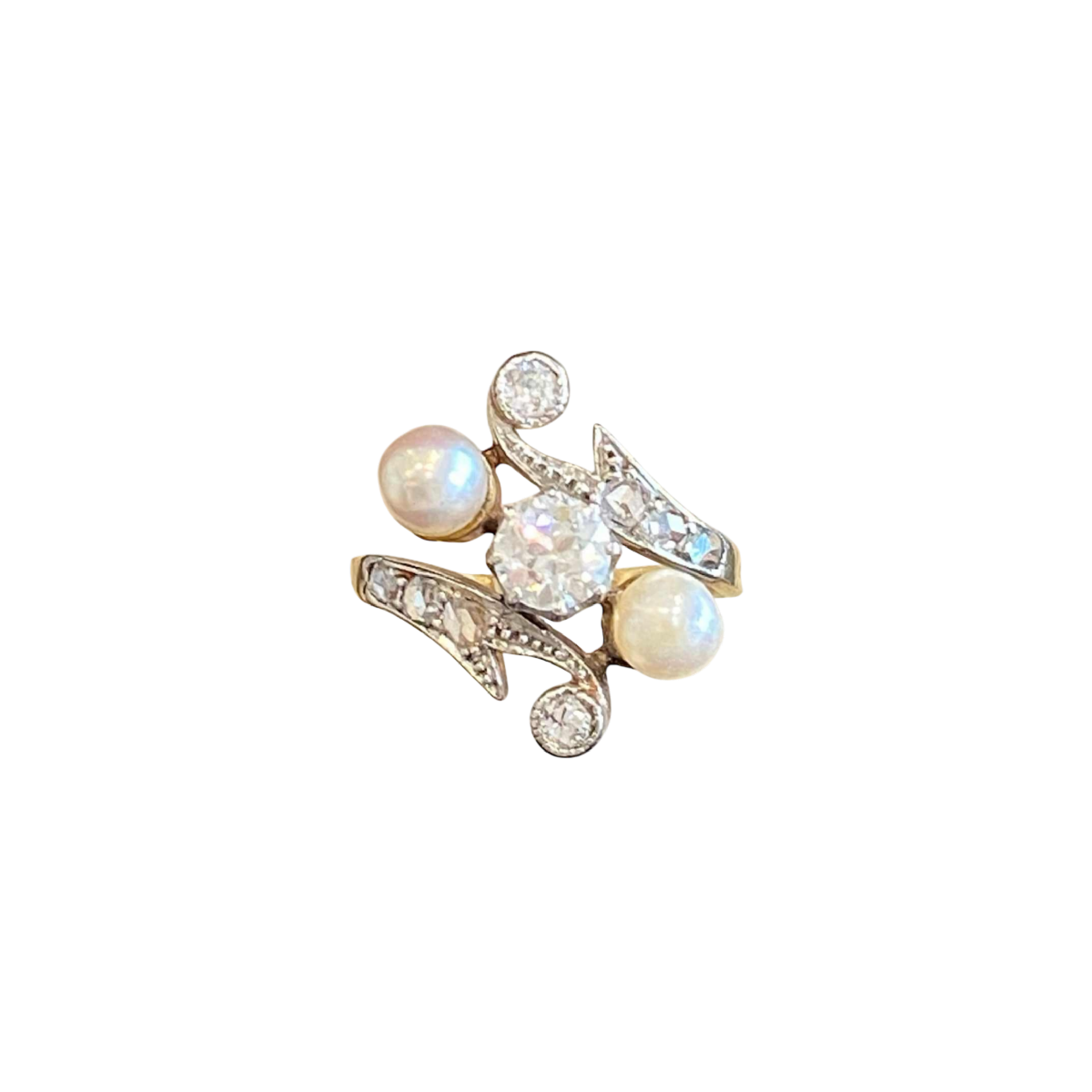 Belle Époque-ring “toi & moi” van goud en platina, met oudgeslepen diamant en parels, ca 1900