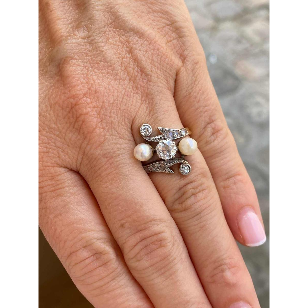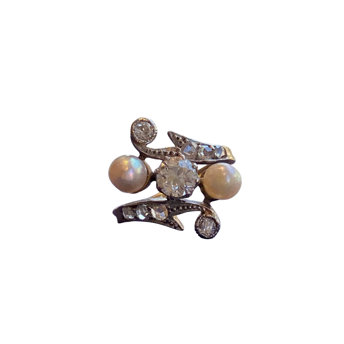 Uitzonderlijke belle époque toi &moi ring in goud en platina bezet met een oud geslepen diamant en twee waarschijnlijk fijne parels.