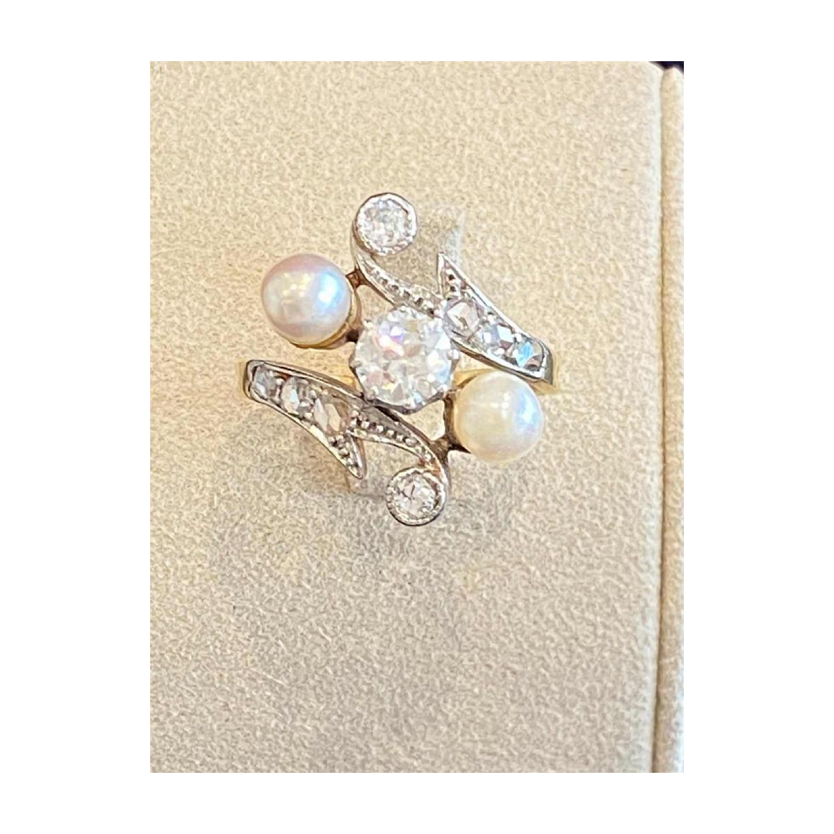 This form is only used to notify us of illegal content on product: Belle Époque-ring “toi & moi” van goud en platina, met oudgeslepen diamant en parels, ca 1900.