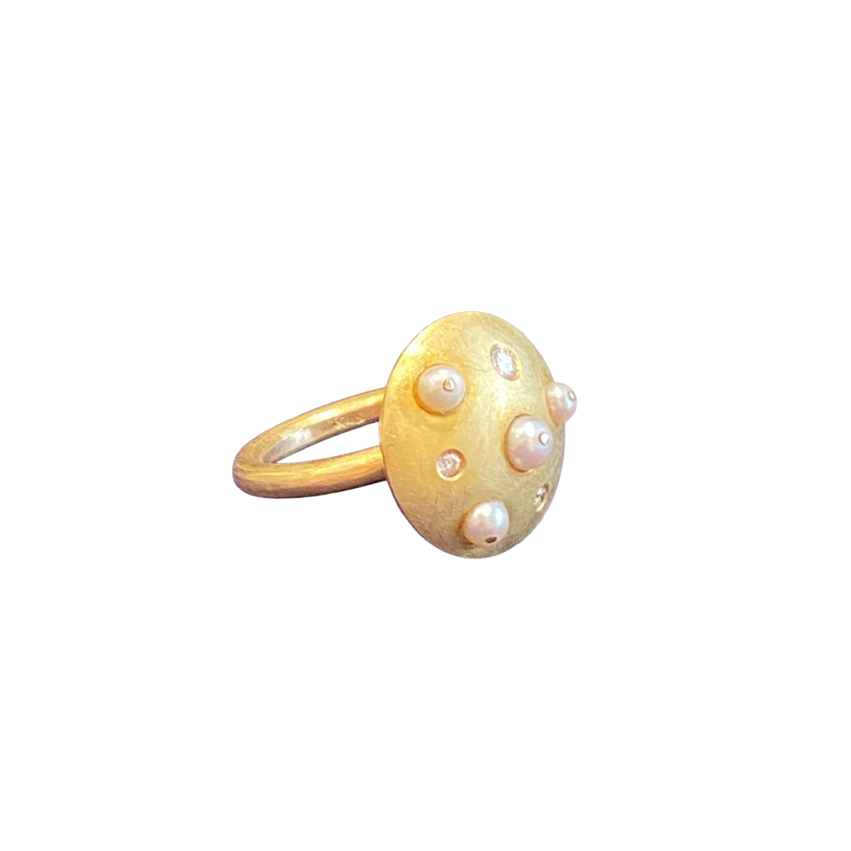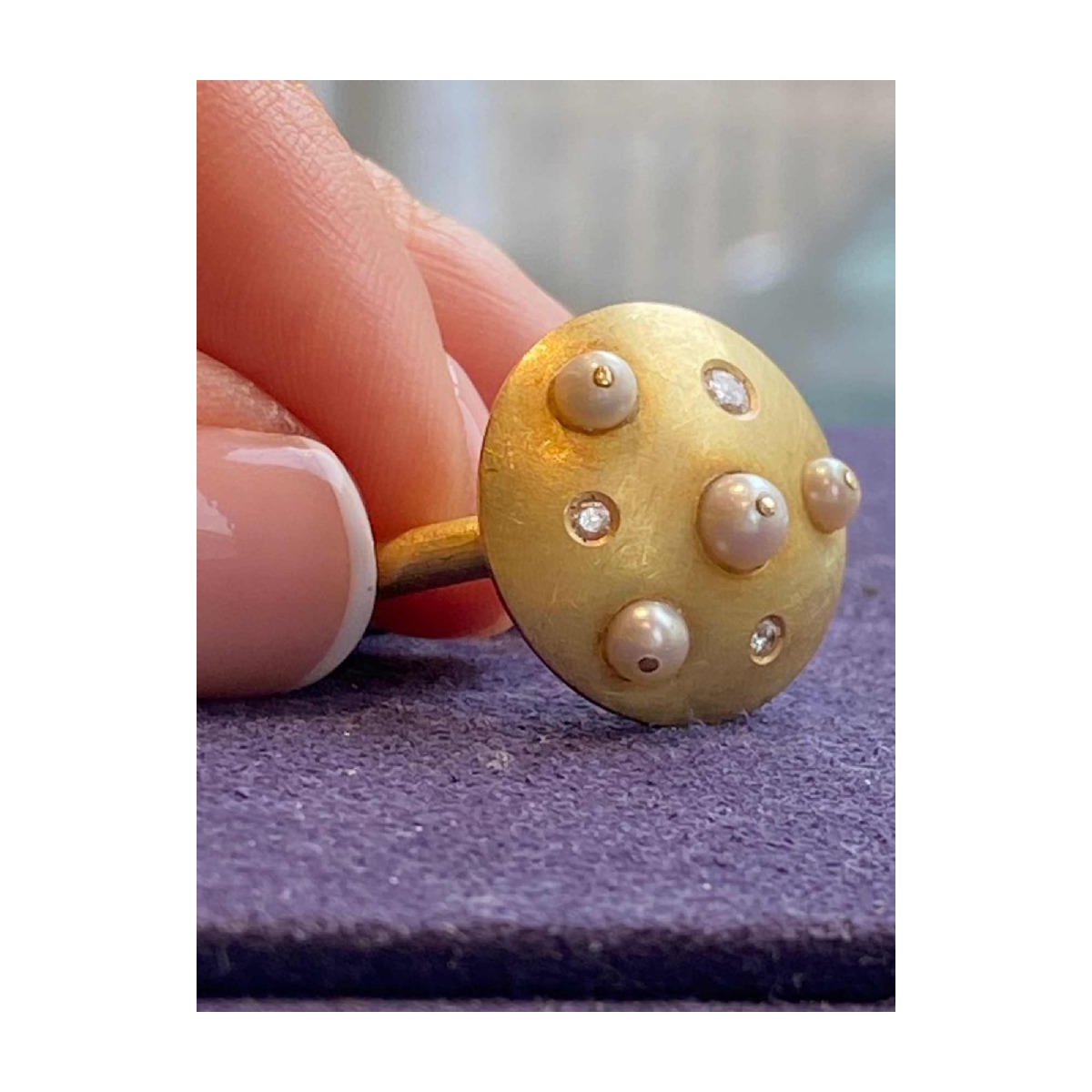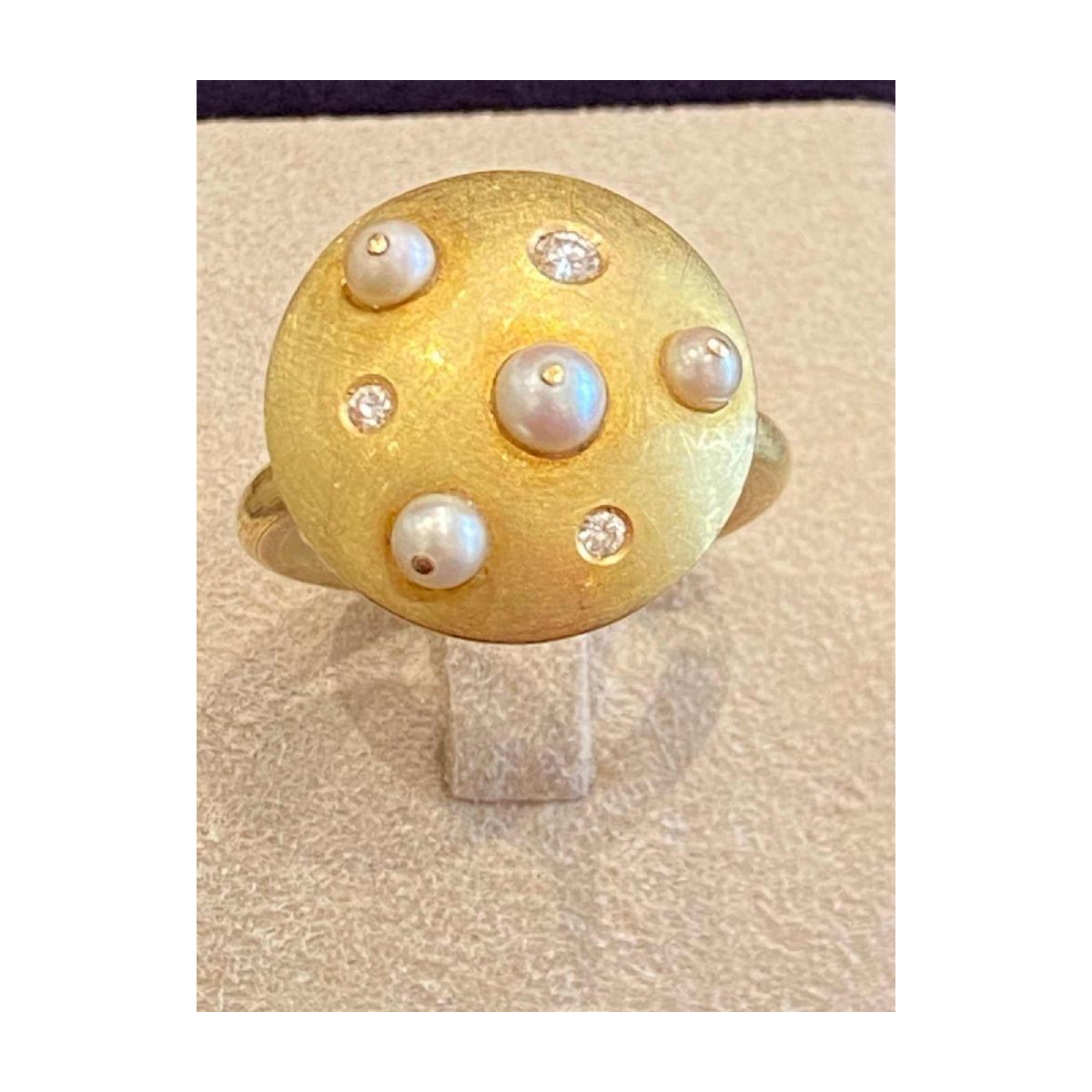 Kunstenaarsring in geborsteld goud, diamanten & gekweekte parels, XXe c