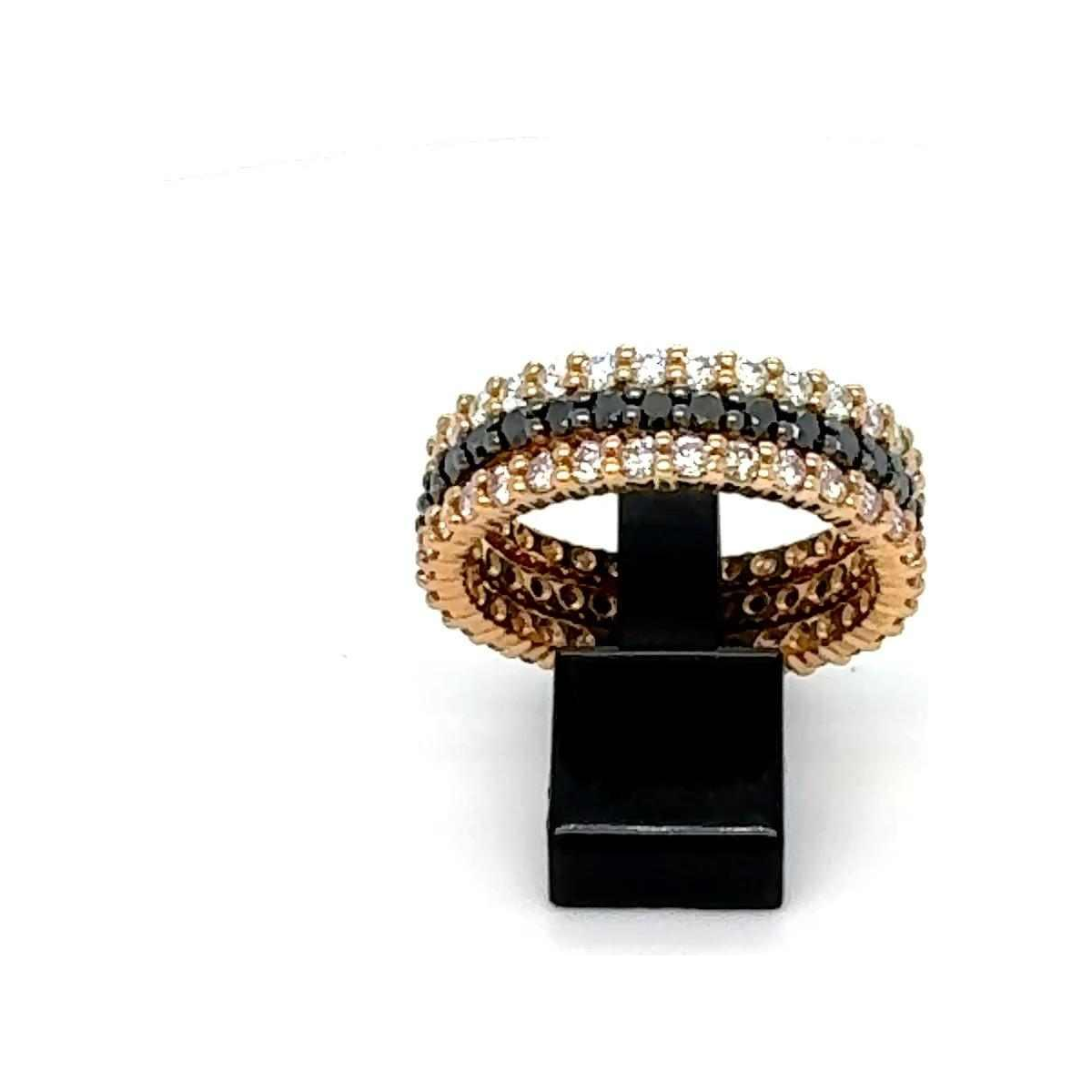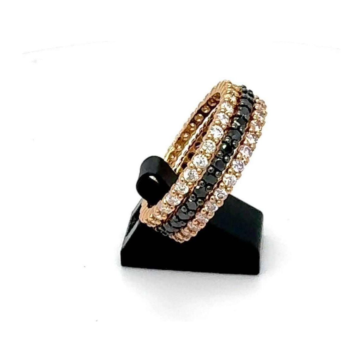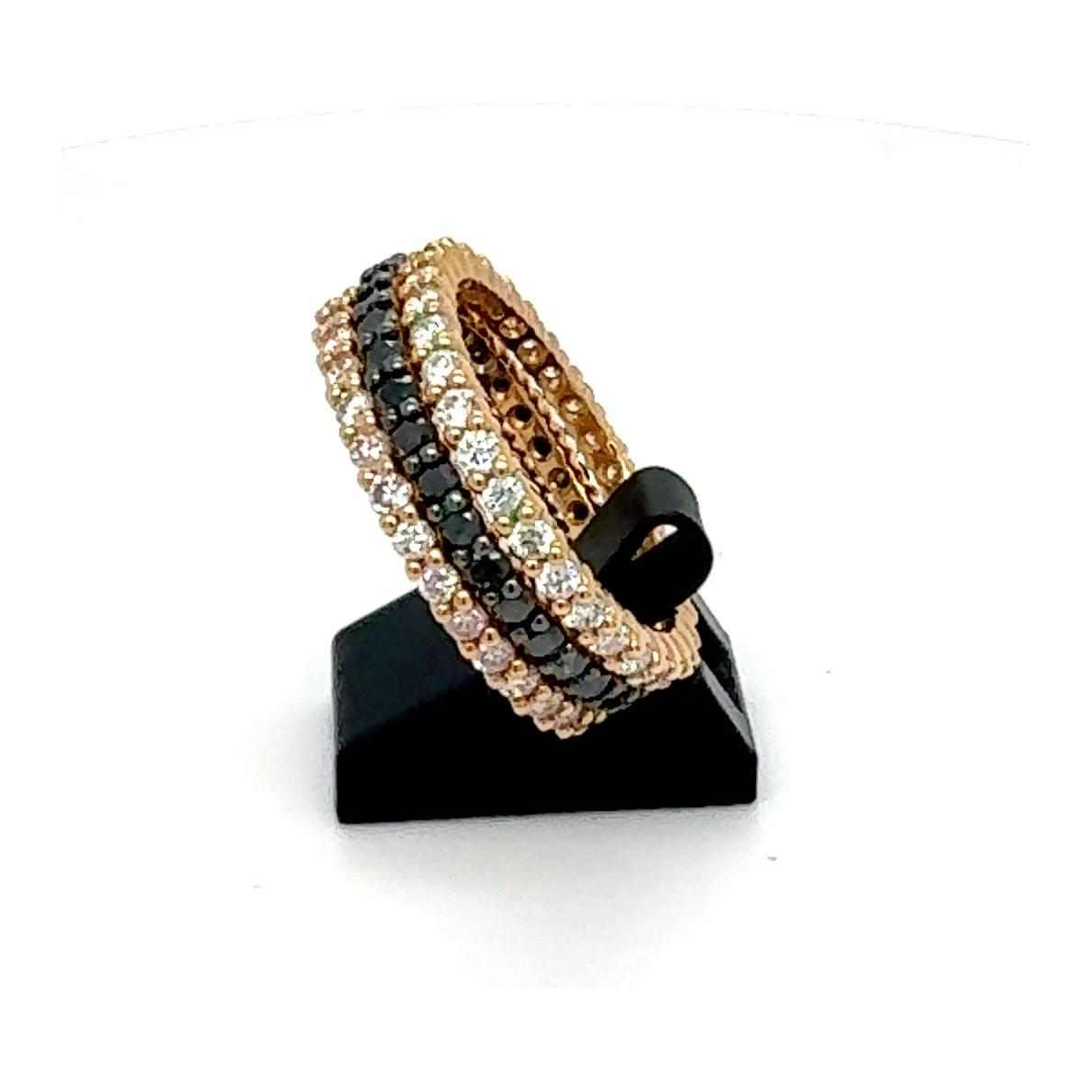 - 2,37 ct witte diamanten. - 0,70 ct natuurlijke roze diamanten. - 0,97 ct zwarte diamanten. - Gewicht: 6,30 g. - Kenmerken: Een unieke combinatie van kleuren die een opvallend contrast creëert, met klassieke helderheid en een gedurfde touch.
